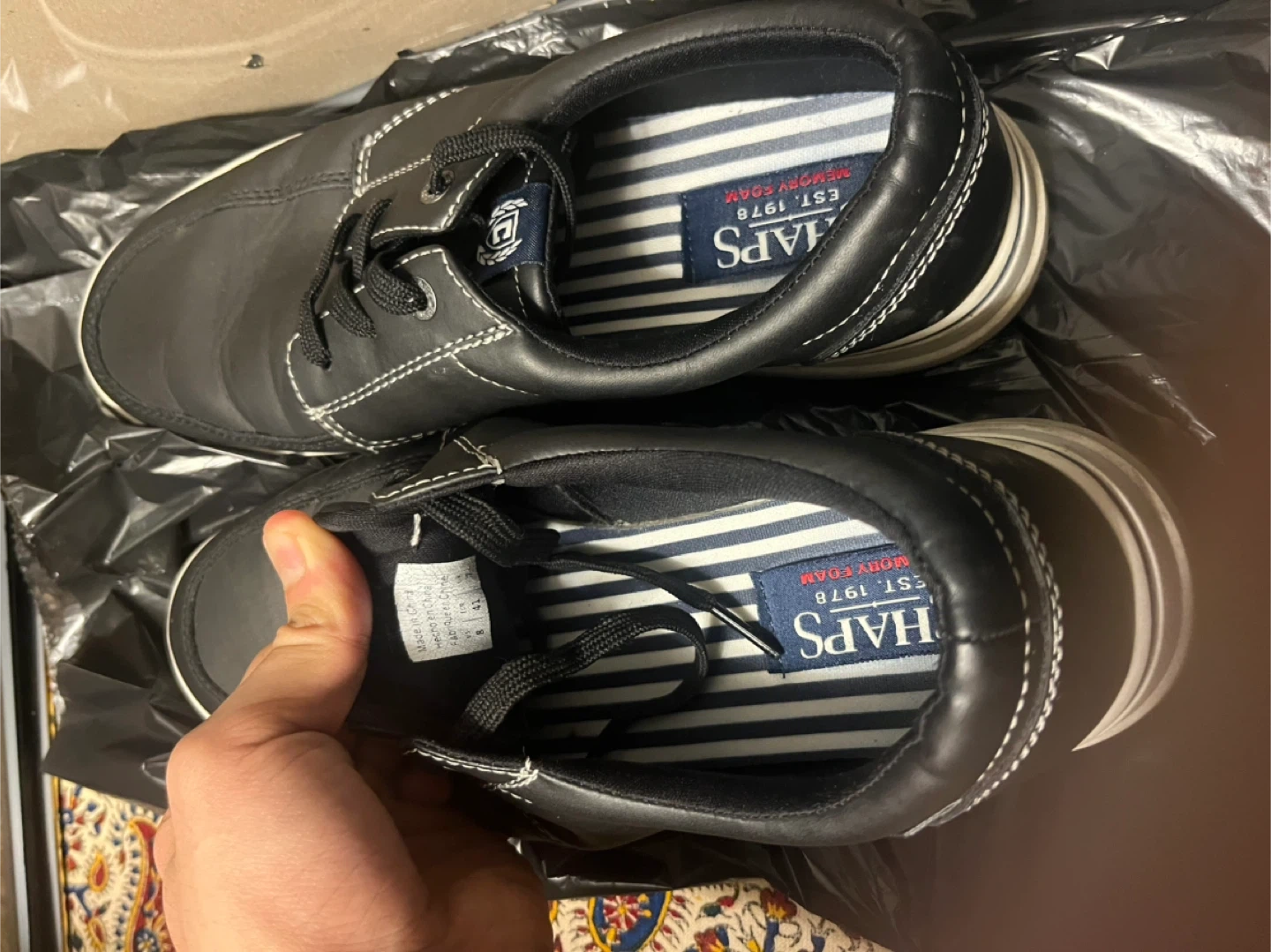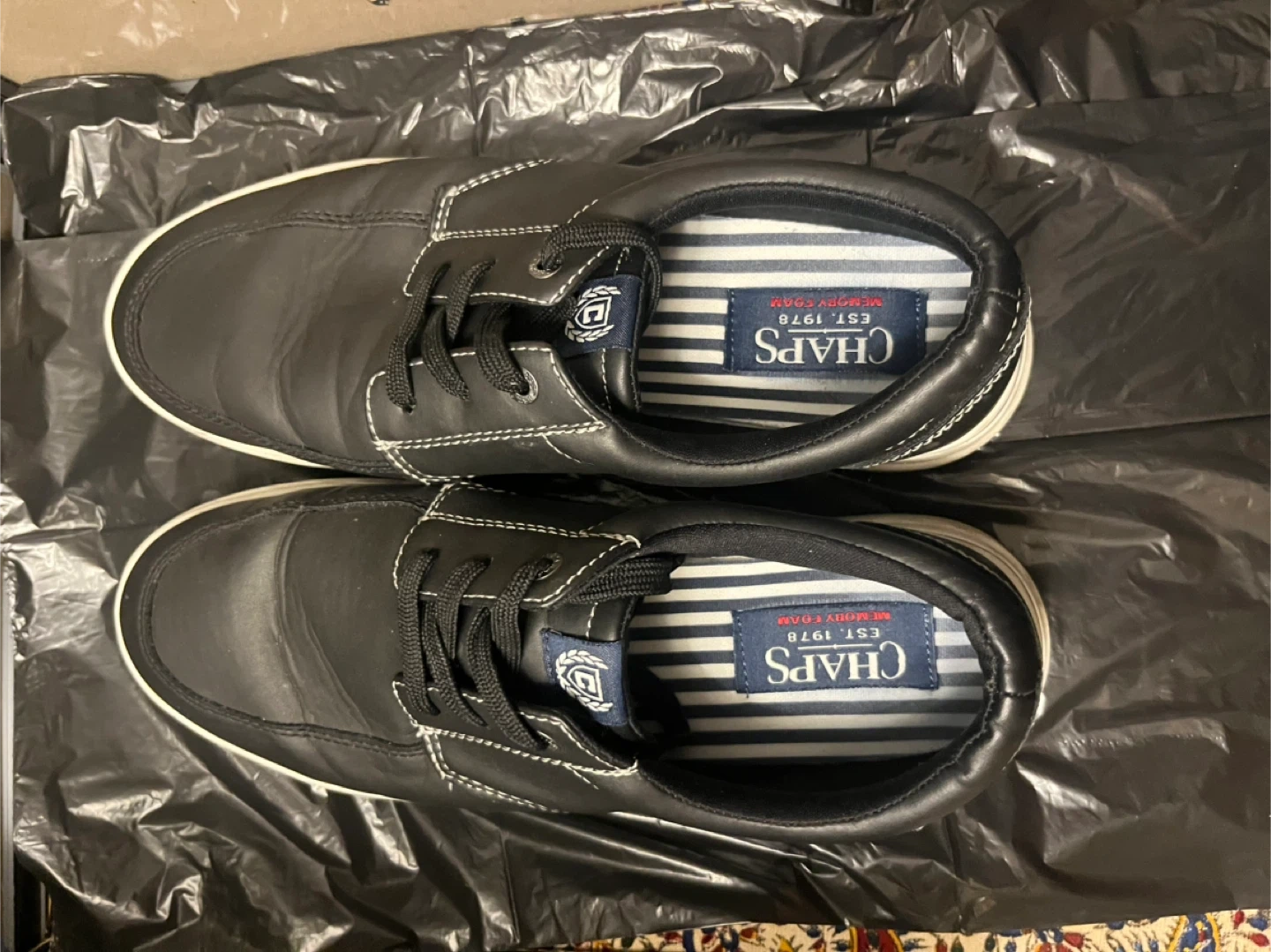 Chaps men's casual shoes in black faux leather. Features a comfortable memory foam insole. These lace-up shoes are great for everyday wear.