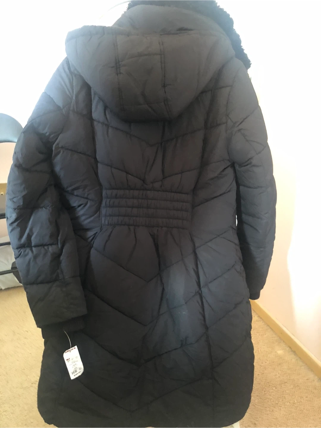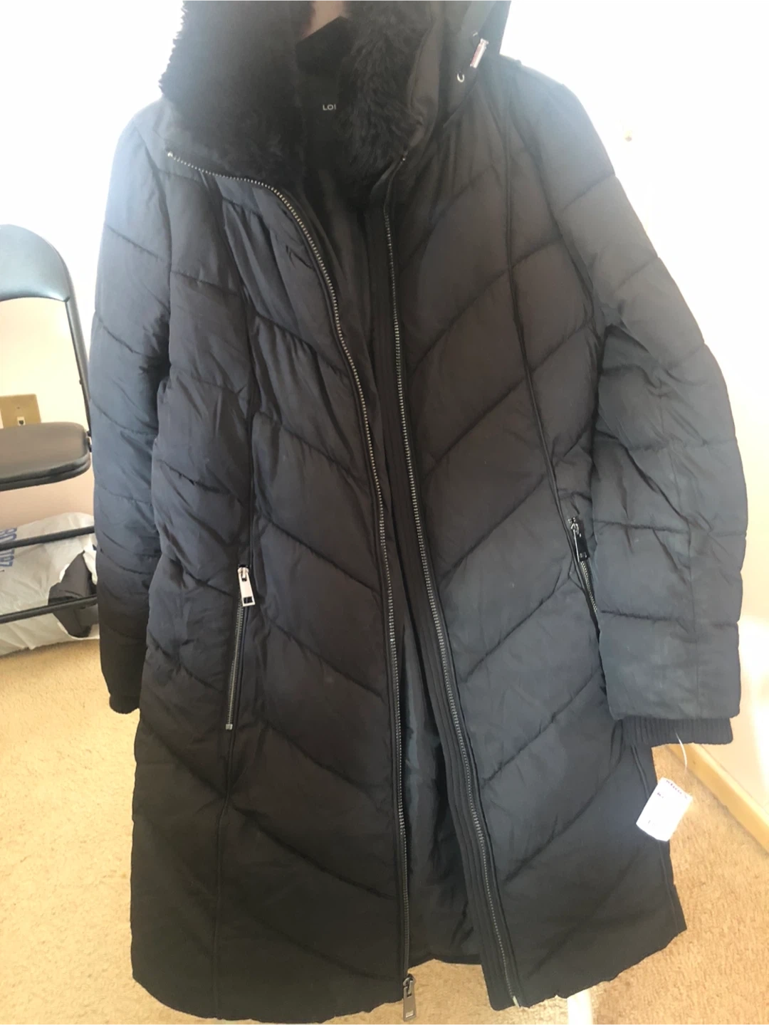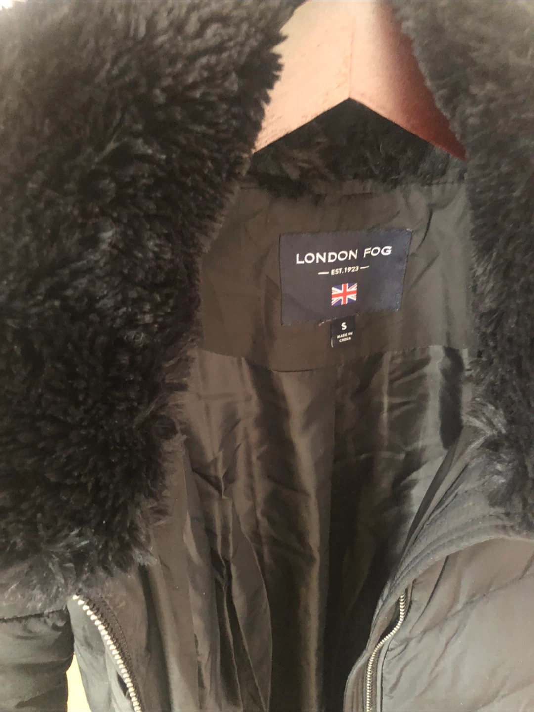 This is a black London Fog puffer coat with a faux fur trimmed hood and collar. It's a size small. The coat features a quilted design and zippered closure.