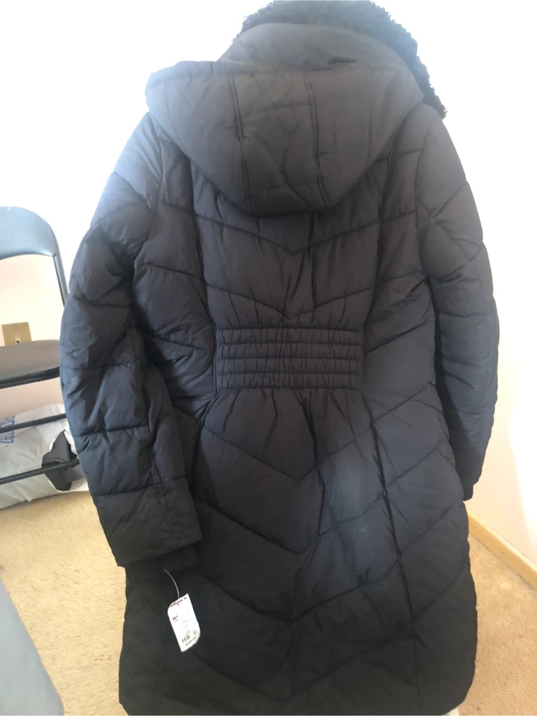 This is a black London Fog puffer coat with a faux fur trimmed hood and collar. It's a size small. The coat features a quilted design and zippered closure.