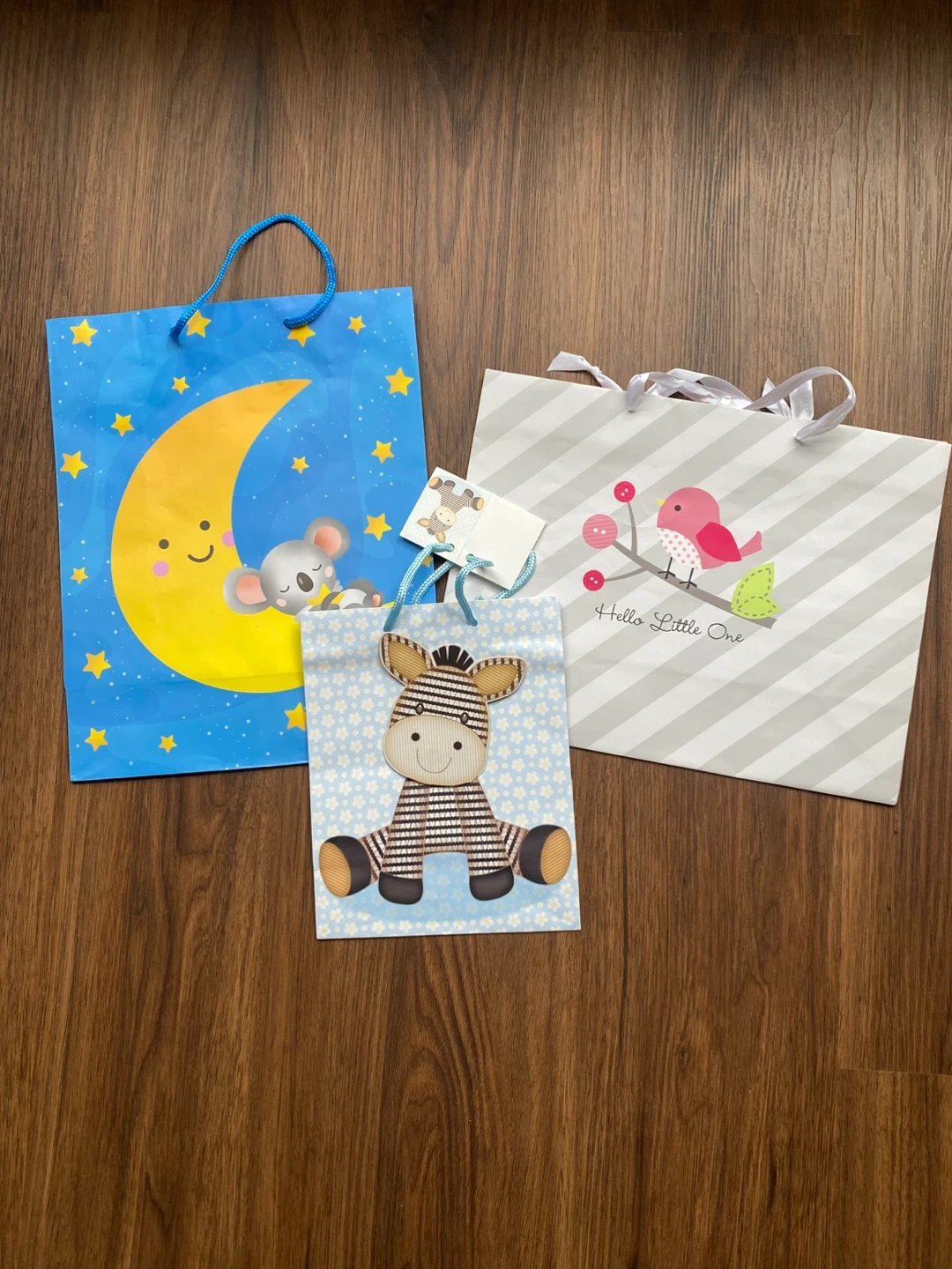 Here's a set of three adorable baby gift bags! They feature cute designs like a koala on the moon, a zebra, and a little bird. Perfect for baby showers or new baby gifts