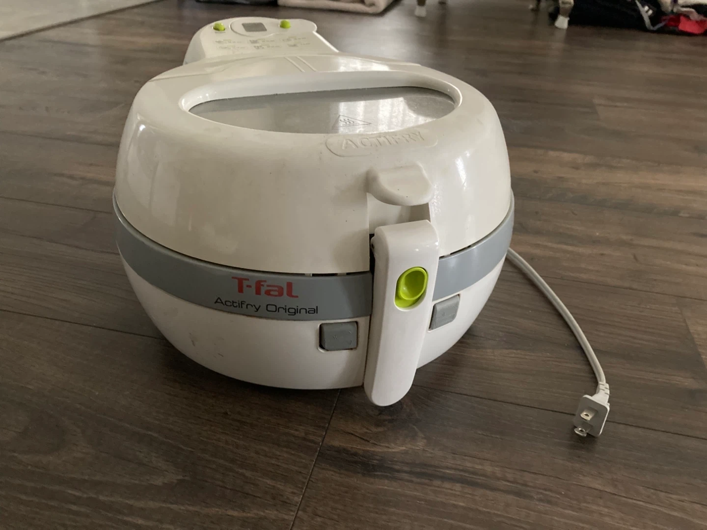 This T-fal ActiFry Original is a white electric cooker. It's designed for various cooking times, with presets for different food types.