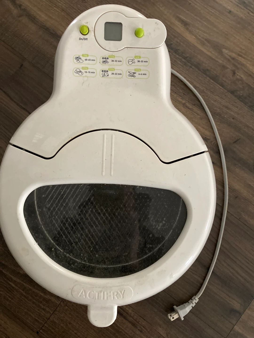 This T-fal ActiFry Original is a white electric cooker. It's designed for various cooking times, with presets for different food types.