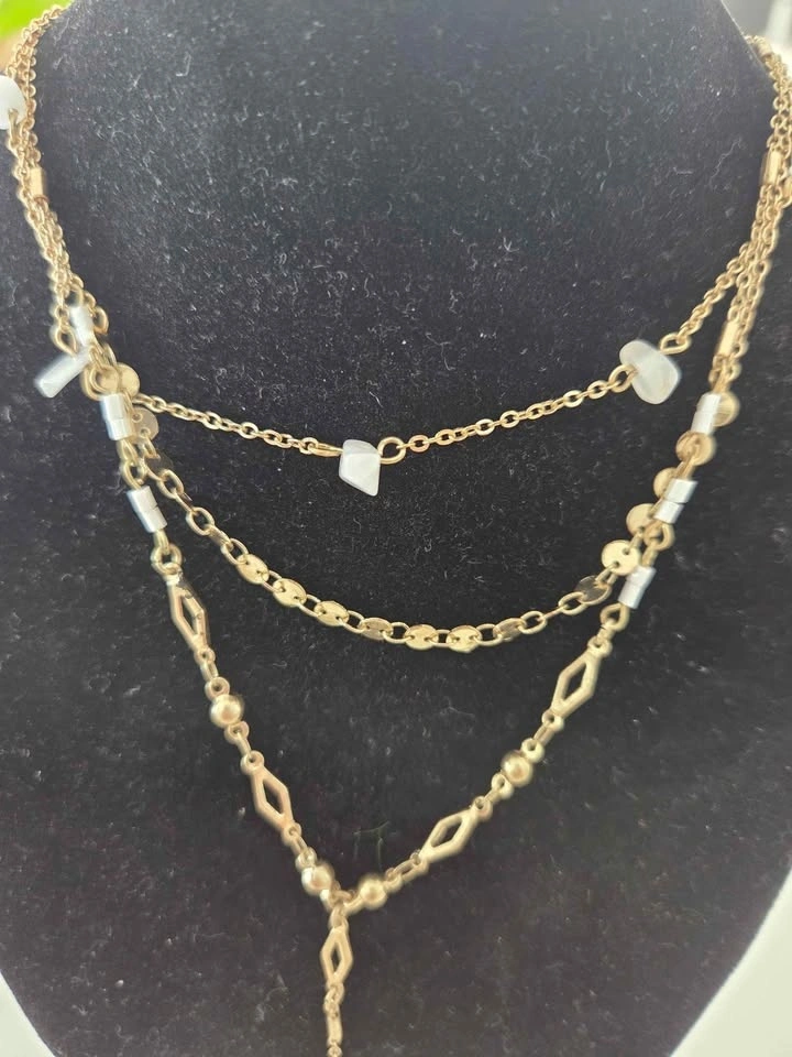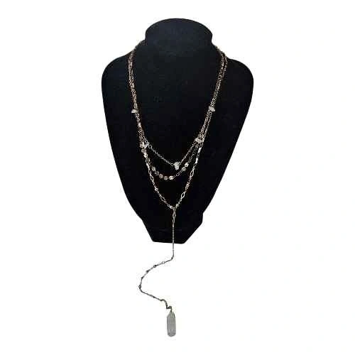 Free People layered gold-tone necklace with a quartz crystal drop. Lightweight, boho-inspired, and easy to style with dresses or casual outfits. Multi-strand design with a lariat finish and crystal accent. Good condition, there is a flaw in the top of the quartz piece, which may be natural. See pics for condition and measurements. Pick up in Oshawa near Rossland and Wilson.