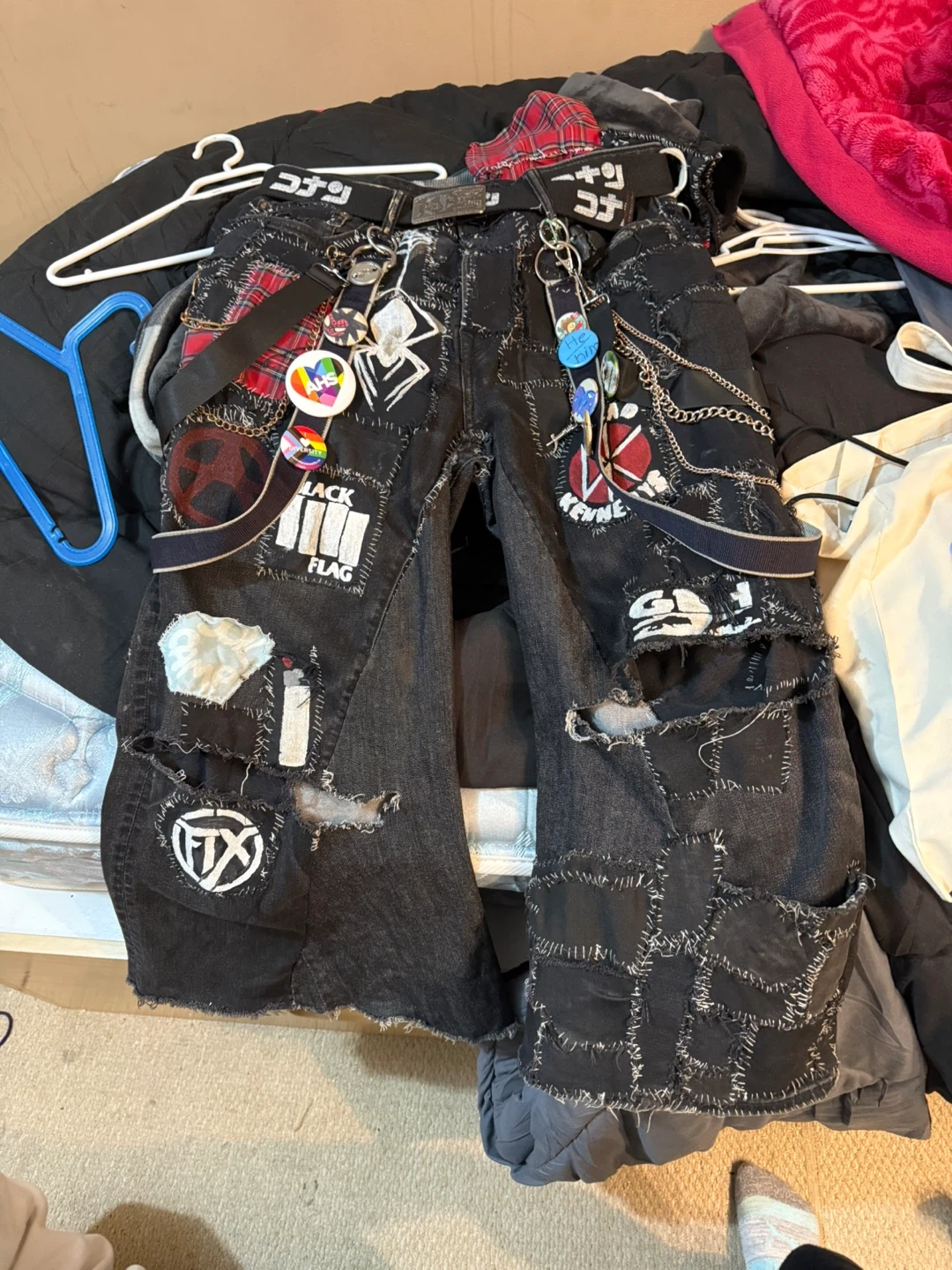 Selling these unique, custom-made patchwork pants! They feature a variety of patches, chains, and straps, giving them a distinct look. Perfect for someone who loves alternative fashion and wants to stand out from the crowd