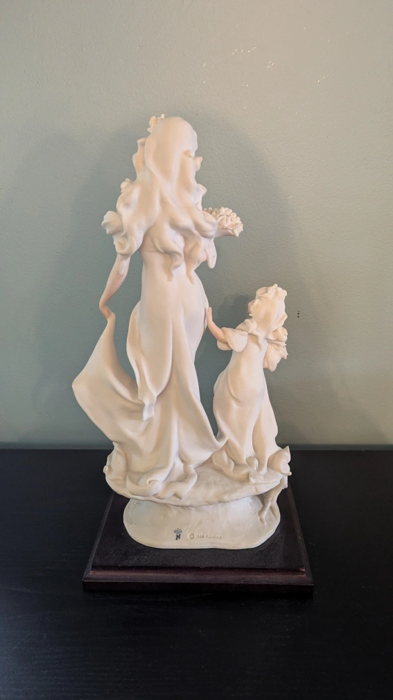 Guiseppe Armani figurine depicting a mother and child holding flowers. This elegant porcelain sculpture is 15 inches tall with artist's markings. Perfect condition collectors piece
