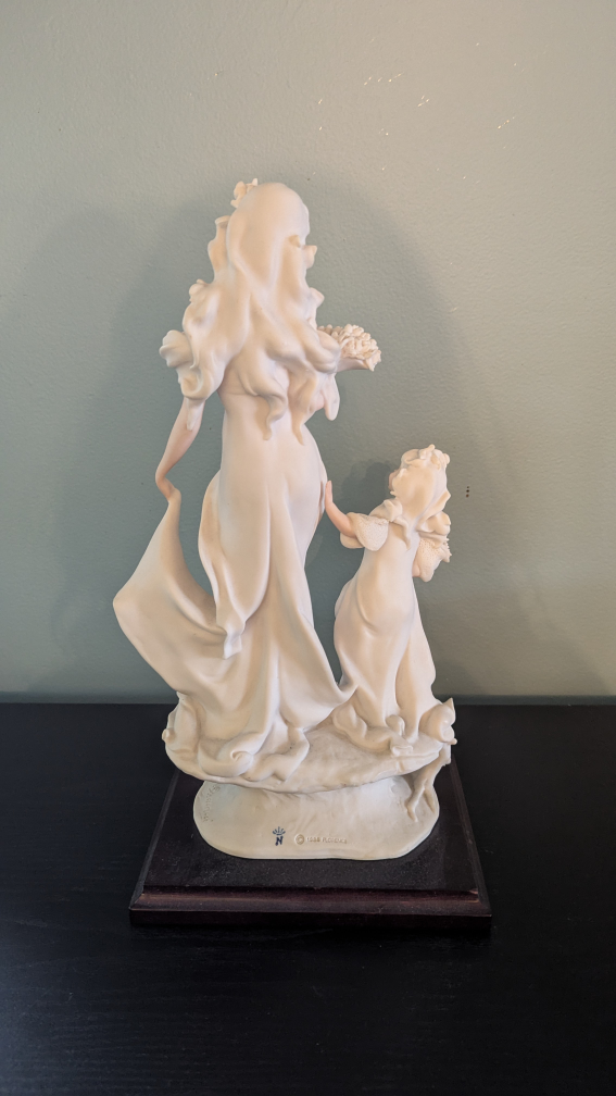 Guiseppe Armani figurine depicting a mother and child holding flowers. This elegant porcelain sculpture is 15 inches tall with artist's markings. Perfect condition collectors piece