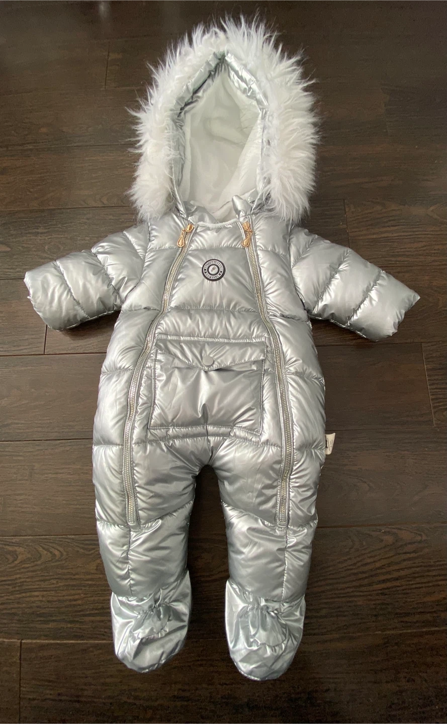 This is a shiny silver baby snowsuit. It features a cozy fur-lined hood and dual zippers for easy access. Material is durable and water-resistant.