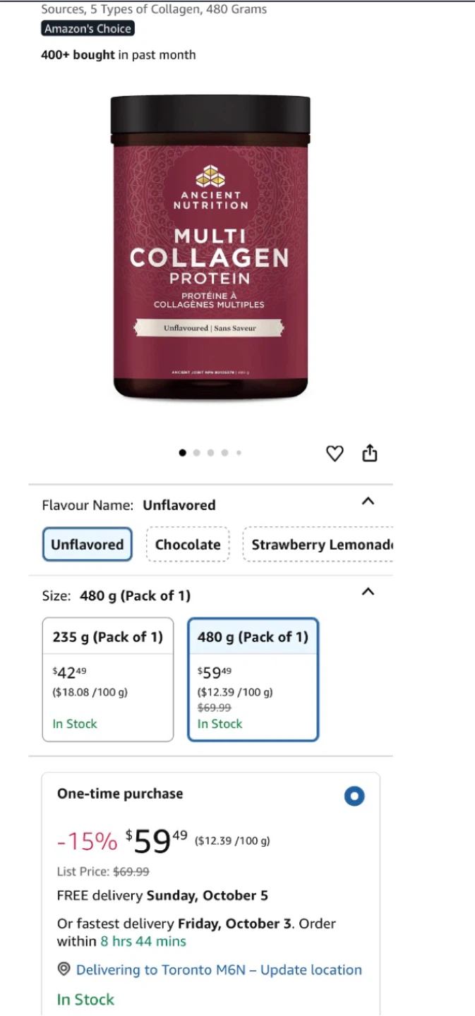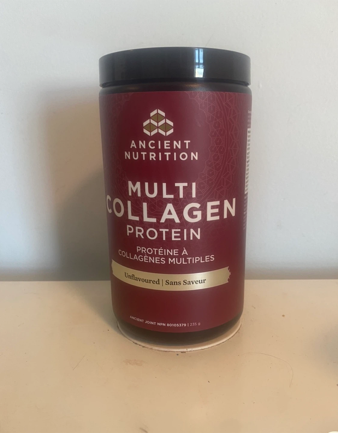 This is a 480g container of Ancient Nutrition Multi Collagen Protein powder. It's unflavoured and contains multiple types of collagen. Great for daily use!