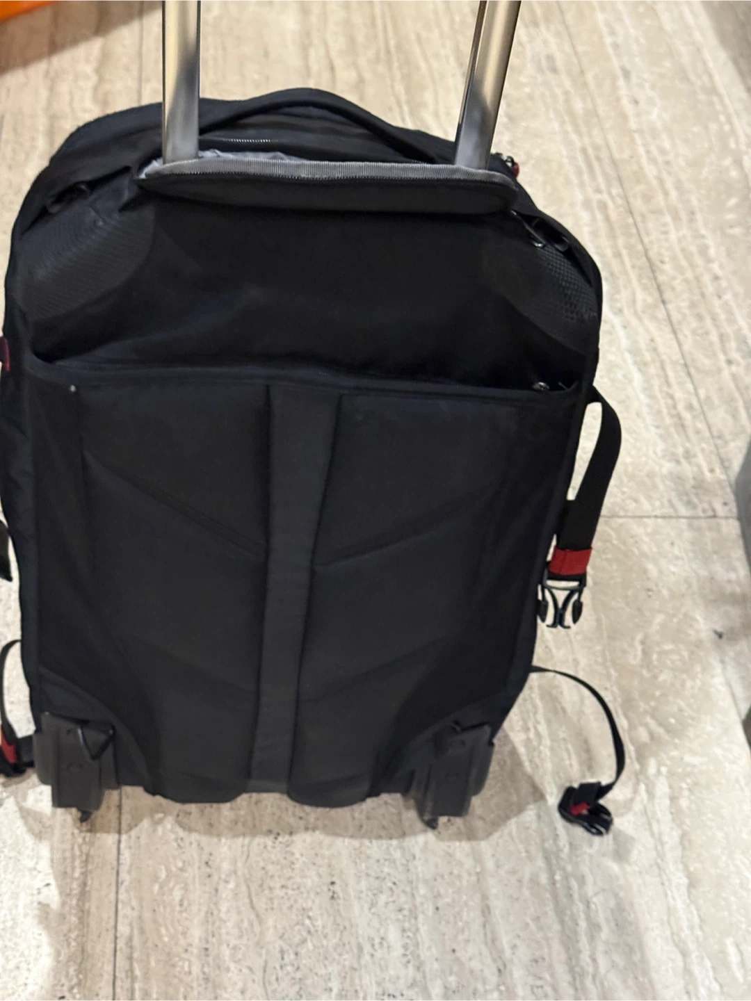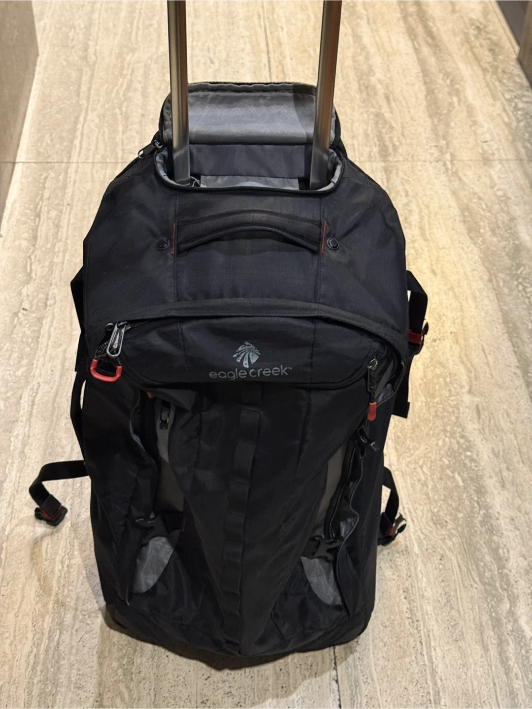 Eagle Creek rolling duffel bag in black. It features durable construction and smooth-rolling wheels for easy transport. This bag is perfect for trips requiring substantial packing space.