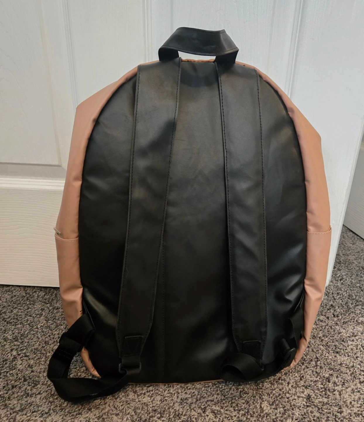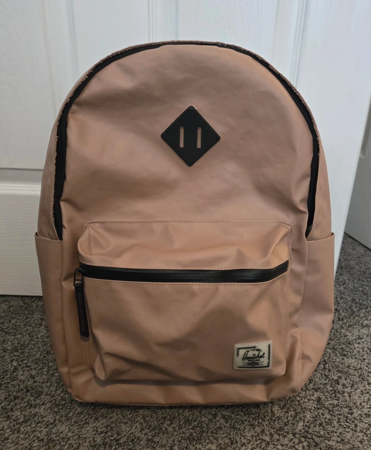 Herschel backpack in a nice blush peach colour. It has a front zippered pocket and adjustable straps. Durable material for everyday use!