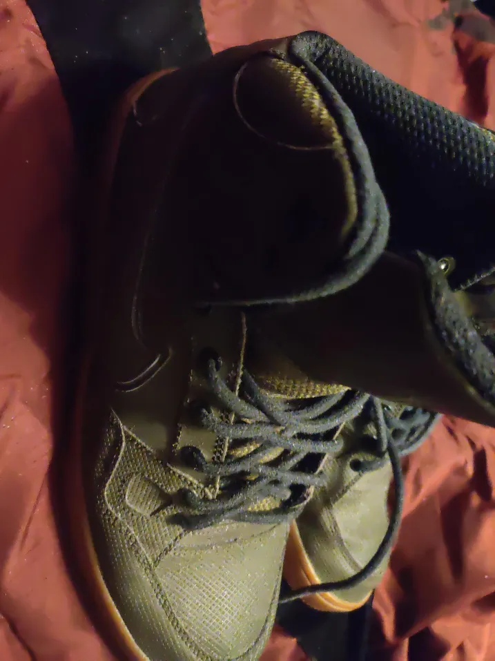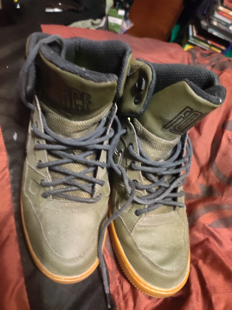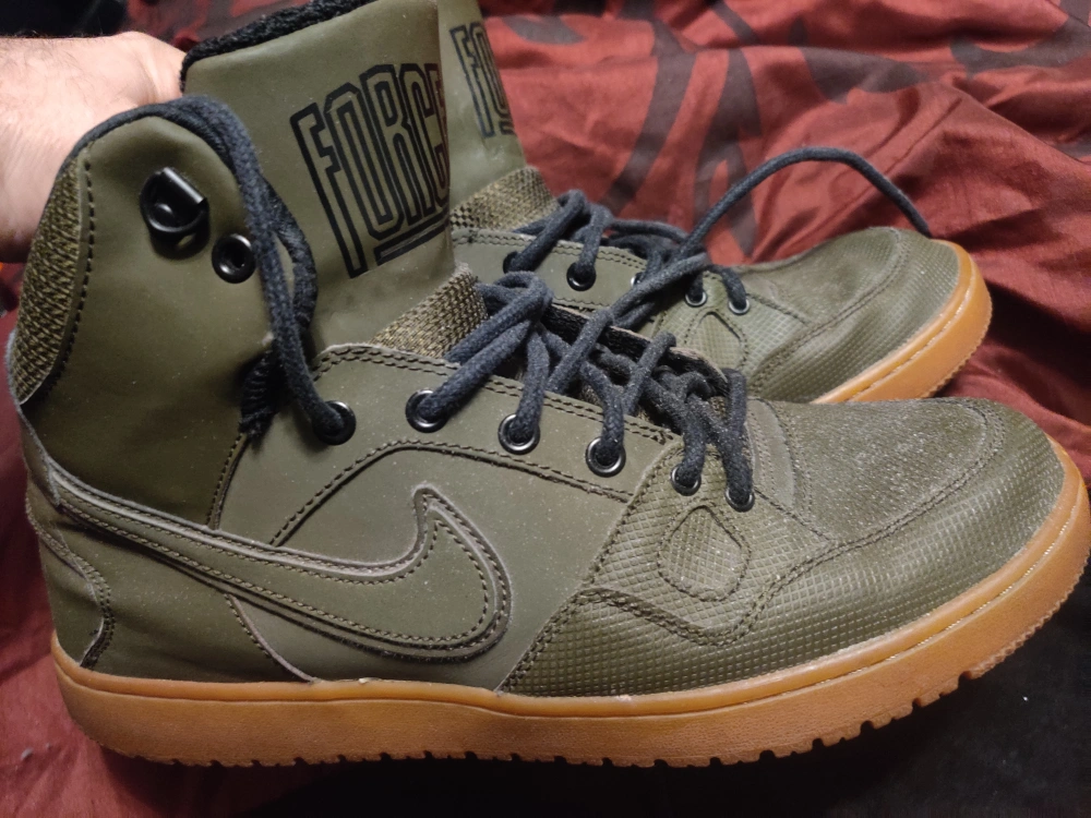 Selling a pair of Nike Force high-top sneakers. They're in good condition and ready for a new owner! The color is a unique olive green with a gum sole. Perfect for casual wear or hitting the streets