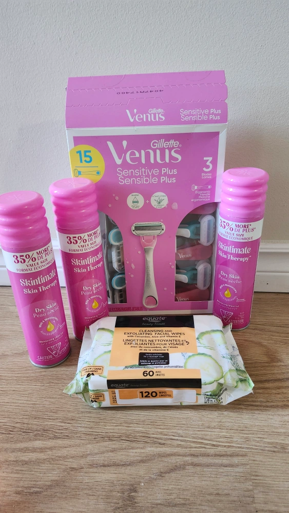 Selling opened Gillette Venus Sensitive Plus razor set! It includes 11 Venus Sensitive Plus razors, 3 new Skintimate Skin Therapy for dry skin, and Equate cleansing and exfoliating facial wipes. Perfect for sensitive skin.