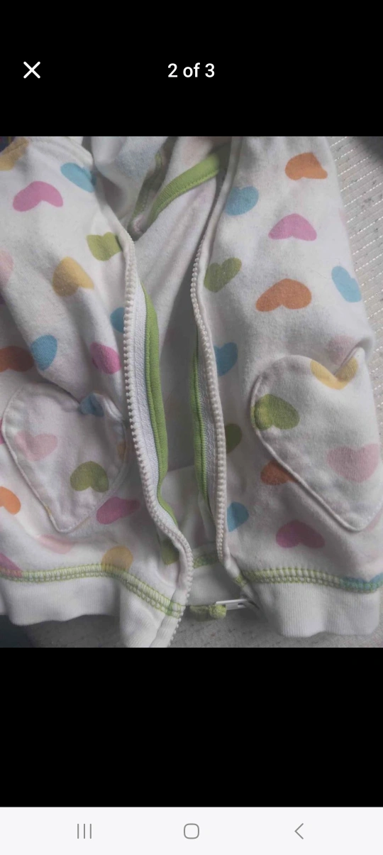 This hoodie has a white background with a colorful heart pattern. It is a lightweight material with a green zipper and trim. It has a hood and front pockets. There is a small Carter's tag on the front. The tag says 9 months and is made in Thailand.