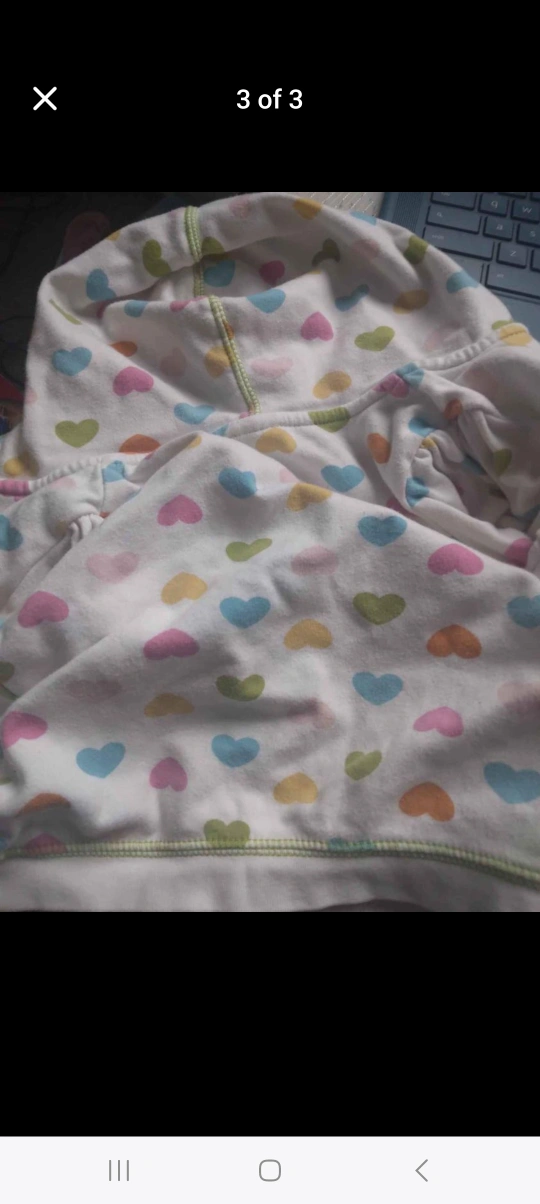 This hoodie has a white background with a colorful heart pattern. It is a lightweight material with a green zipper and trim. It has a hood and front pockets. There is a small Carter's tag on the front. The tag says 9 months and is made in Thailand.