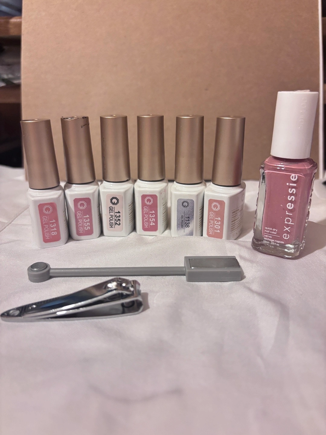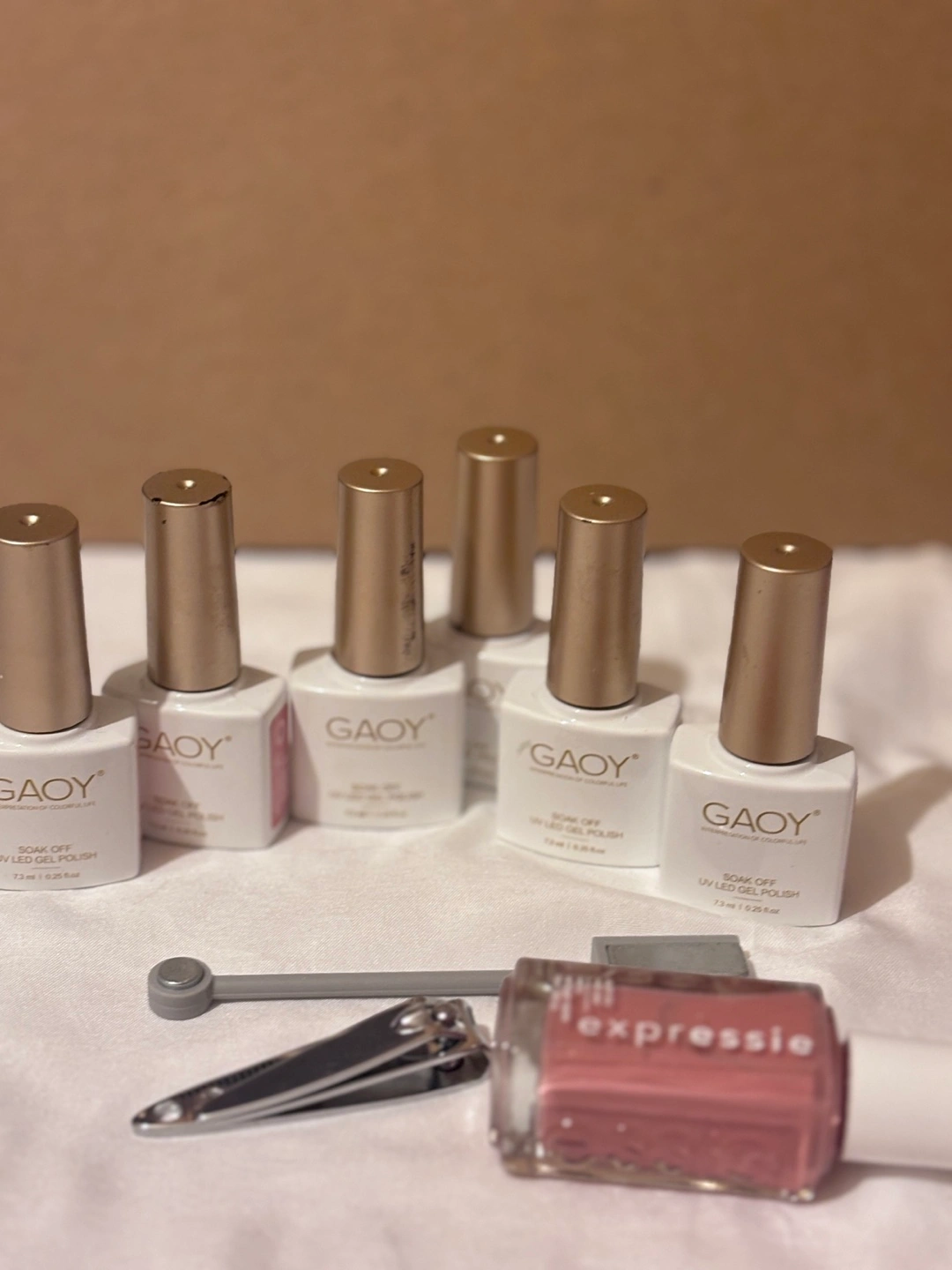 Six GAOY soak-off gel polishes in various colours. Includes one Expresssie nail polish and manicure tools. Great for at-home manicures.