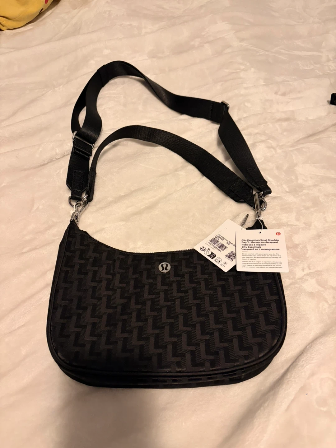 This Lululemon Everywhere Belt Bag is a small shoulder bag. It's black with a repeating L pattern. Includes the original tag.