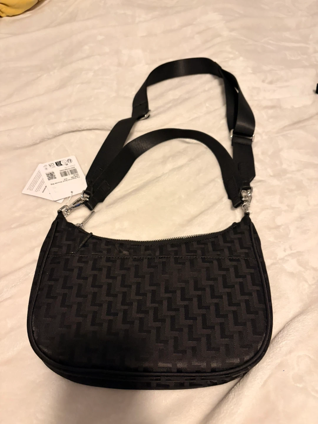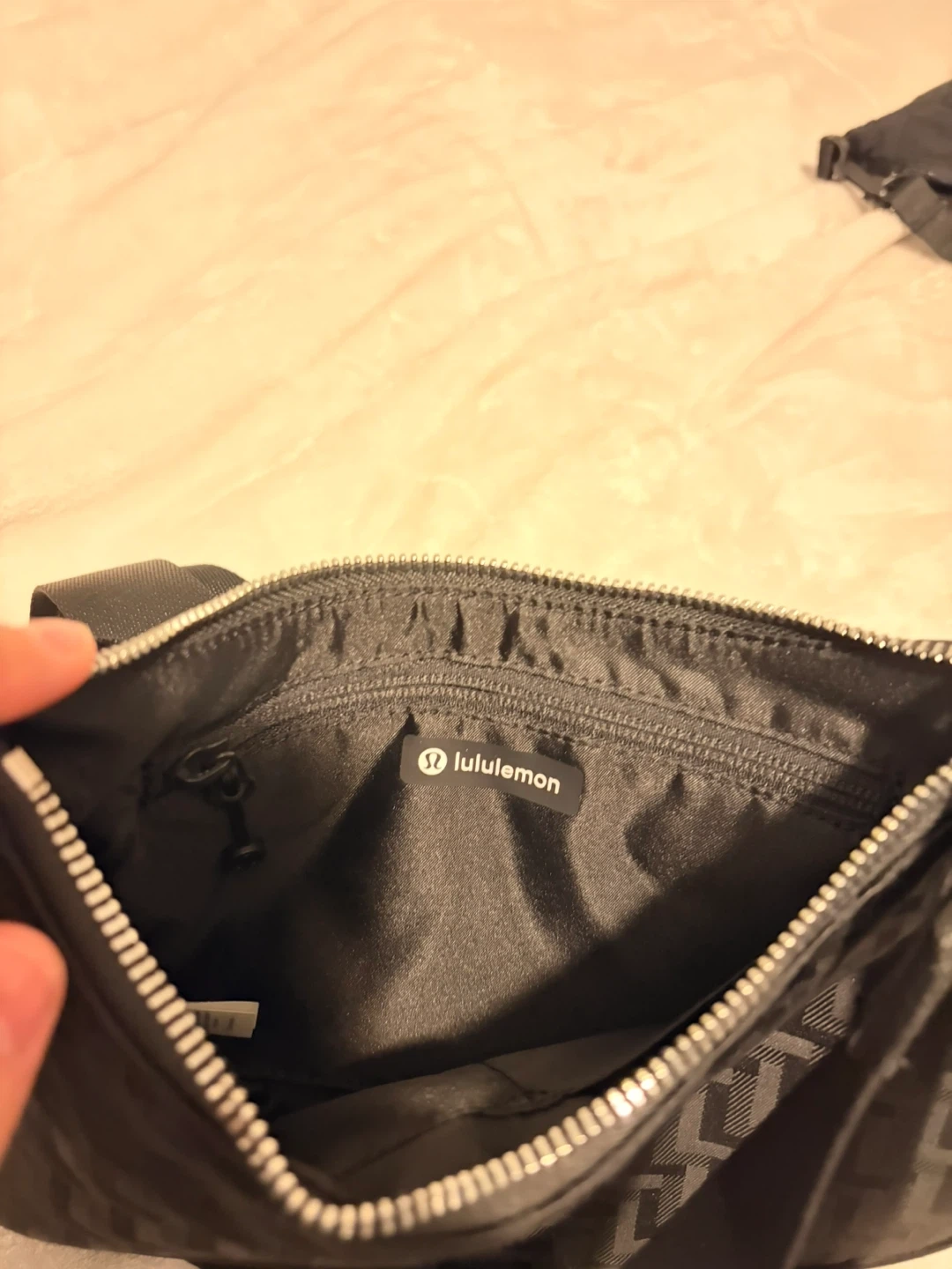 This Lululemon Everywhere Belt Bag is a small shoulder bag. It's black with a repeating L pattern. Includes the original tag.