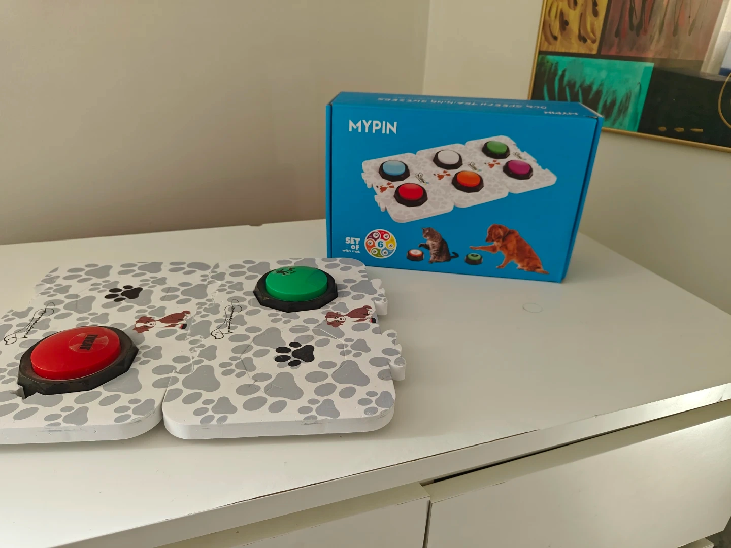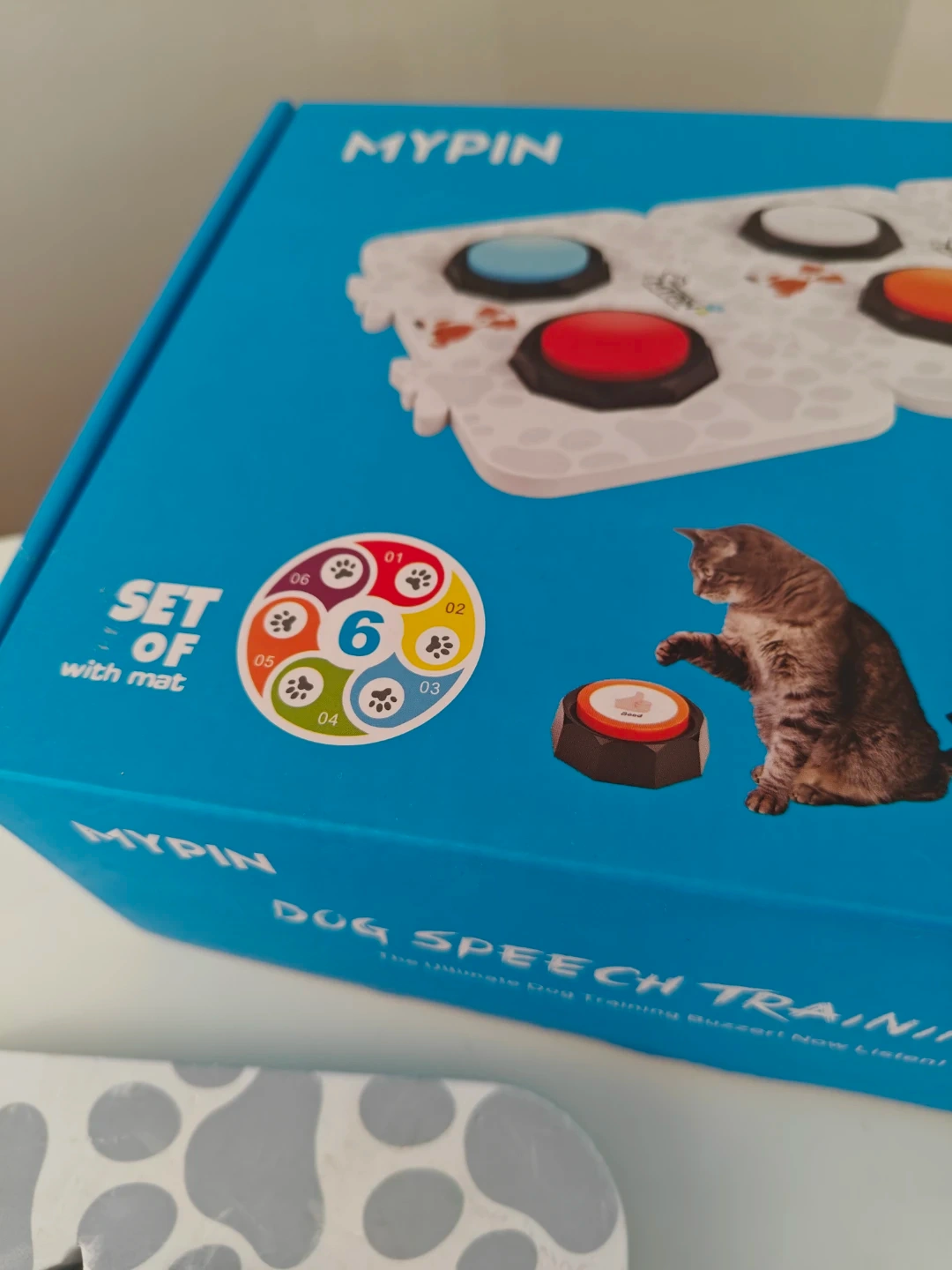 This is a MYPIN Dog Speech Training Buzzer set, featuring six buttons and a mat. It's designed for dog training, allowing pets to communicate basic needs. Includes stickers with words like 'YES', 'MOM', and 'OUTSIDE'.