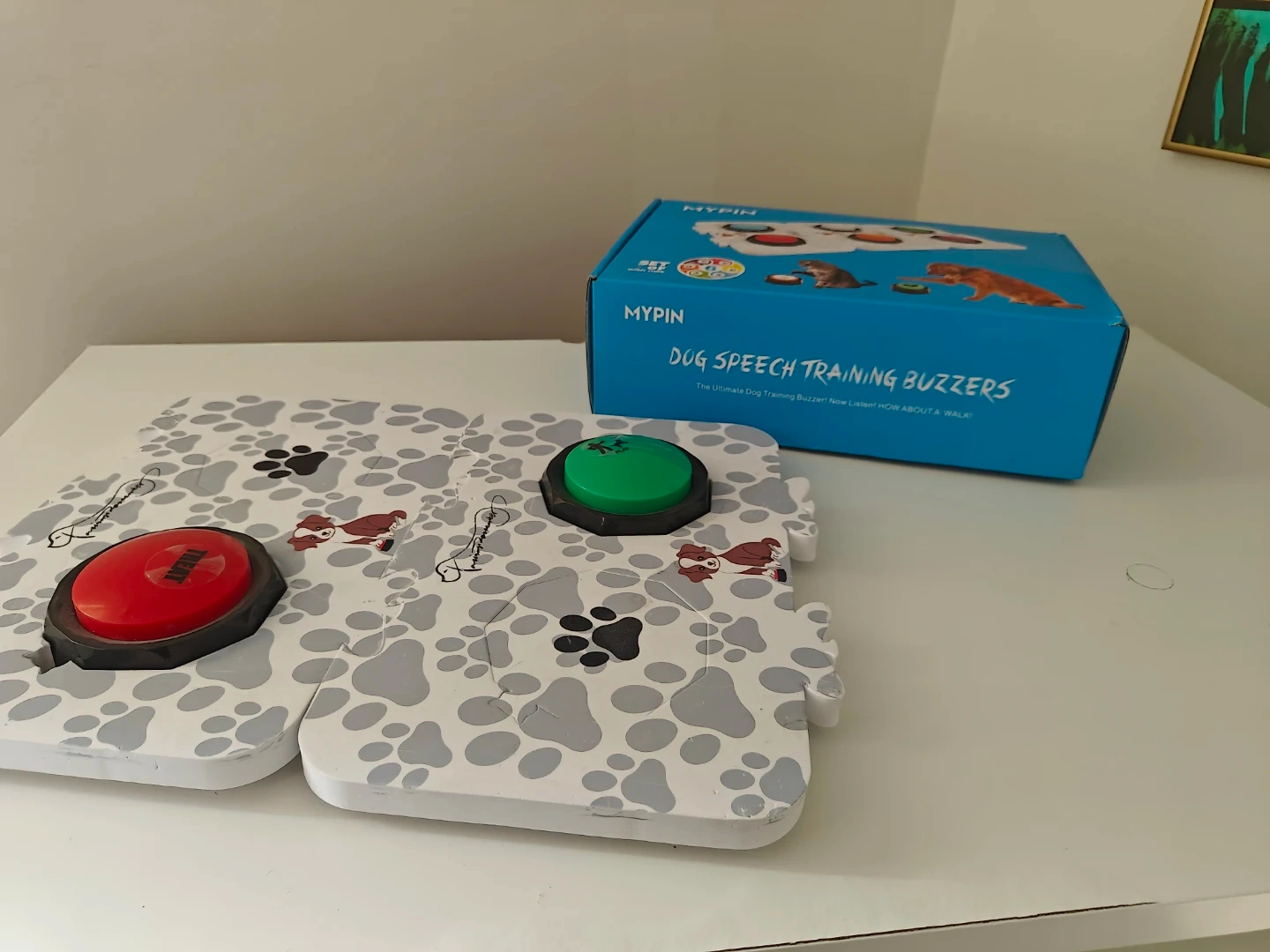 This is a MYPIN Dog Speech Training Buzzer set, featuring six buttons and a mat. It's designed for dog training, allowing pets to communicate basic needs. Includes stickers with words like 'YES', 'MOM', and 'OUTSIDE'.