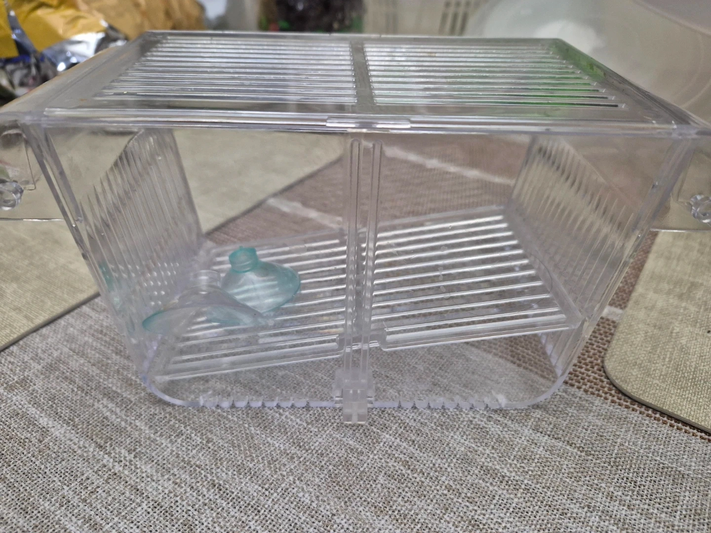 This clear plastic divider box separates fish or fry in your aquarium. It includes suction cups for secure placement. The design allows for good water circulation.