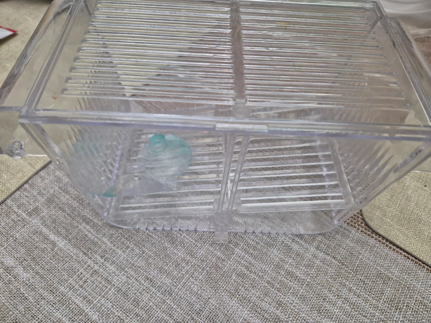 This clear plastic divider box separates fish or fry in your aquarium. It includes suction cups for secure placement. The design allows for good water circulation.