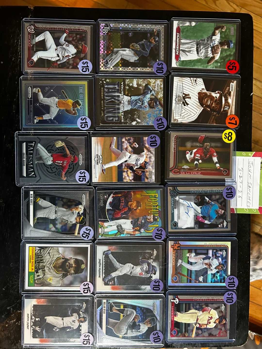 Mixed collection of various Topps and Panini baseball cards. Includes Bowman, Prizm, and Stadium Club sets. Features players like Bobby Witt Jr., Shohei Ohtani, and Bryce Harper. Cards are in protective sleeves.