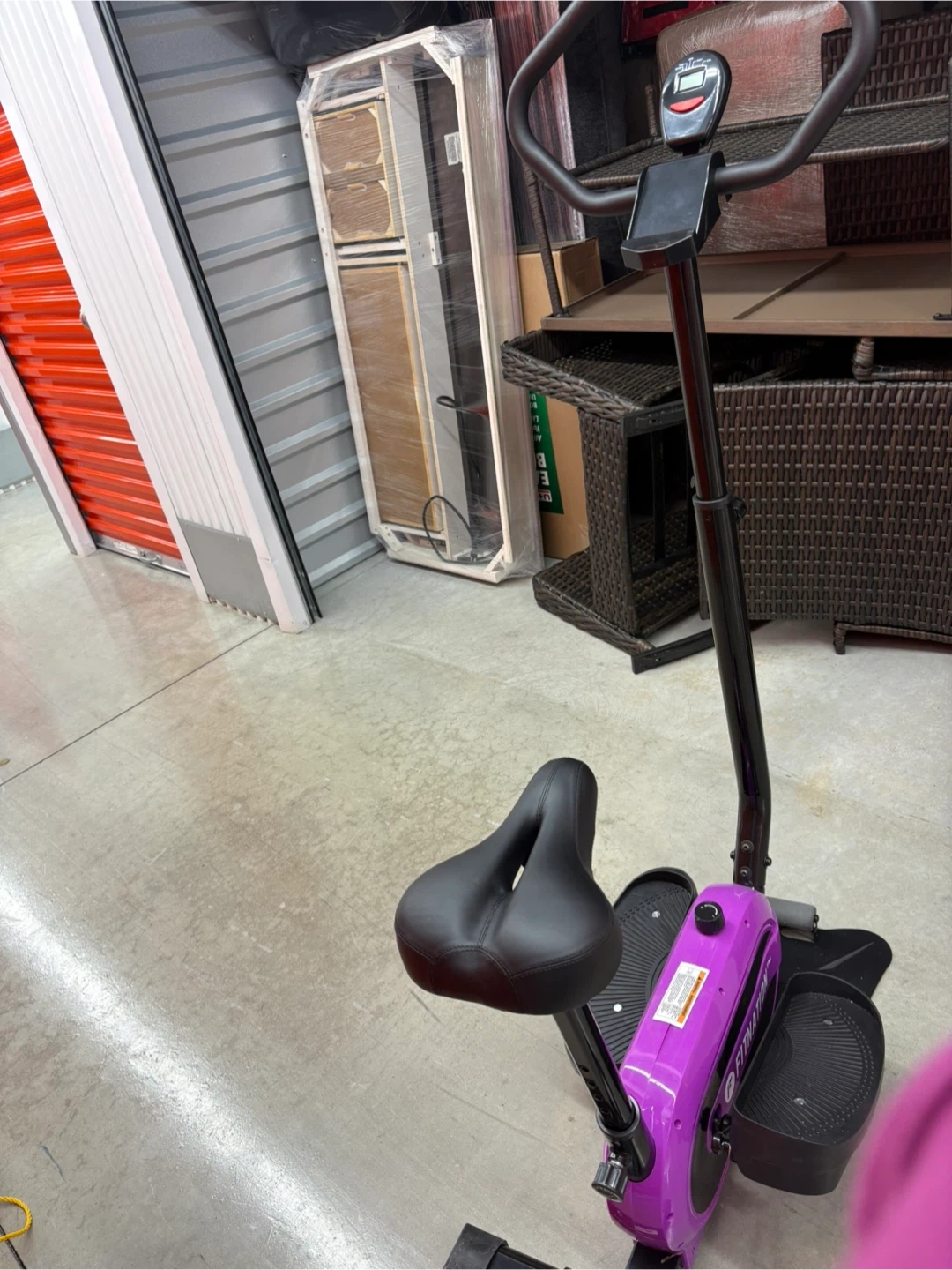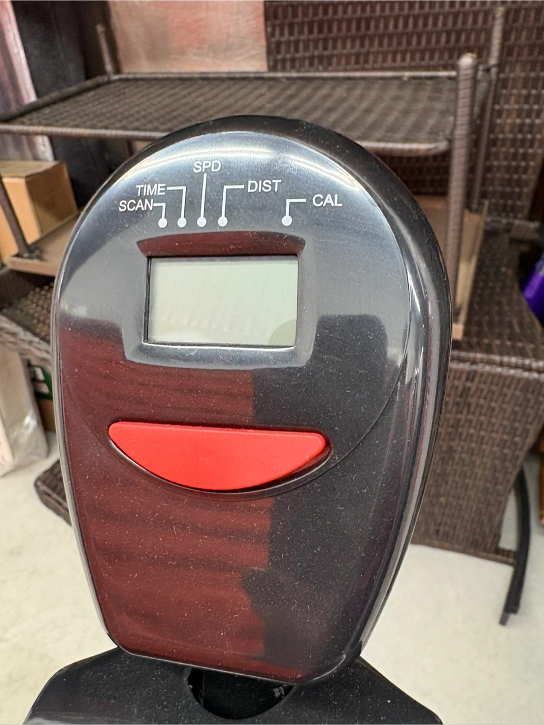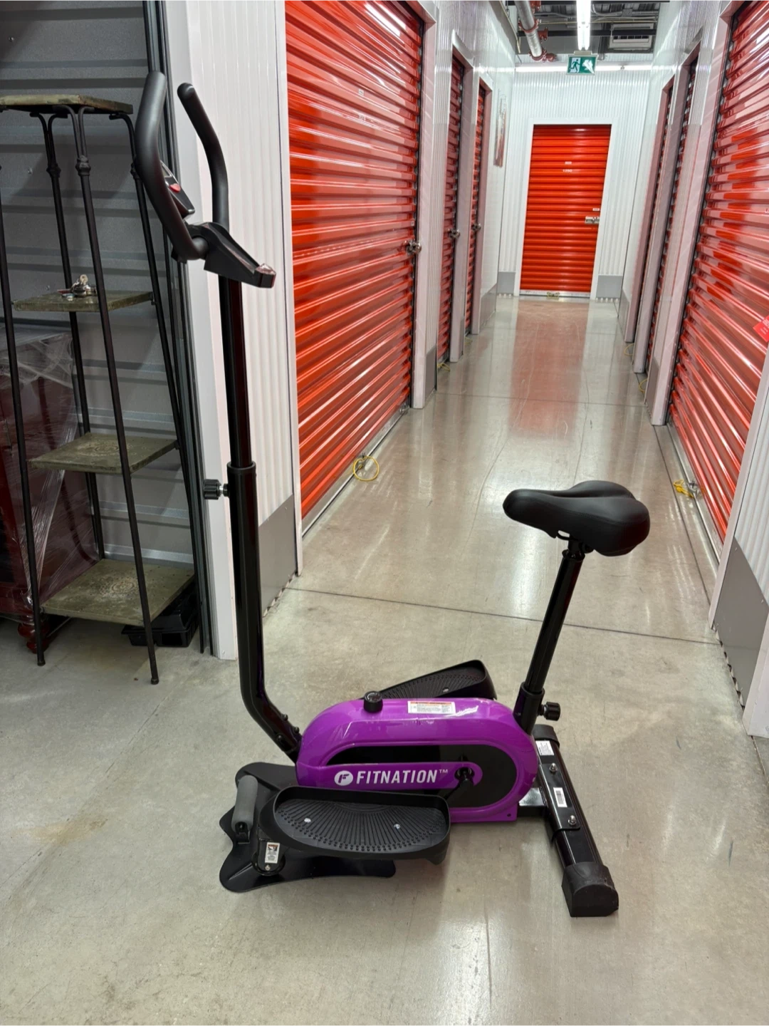 This Fitnation machine offers an elliptical and stationary bike experience. It features a display for time, speed, distance, and calories burned. It's great for a home workout!
