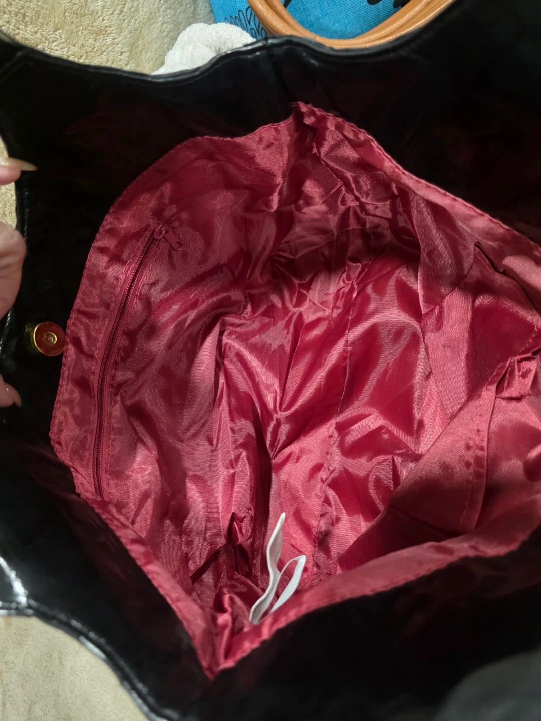 Here's a stylish black nylon tote bag! It features gold-tone hardware and patent leather accents. The interior is lined with a burgundy red fabric and is very specious with few ins& outside compartments to keep you organized, bag is in brand new condition and ready for a new owner .