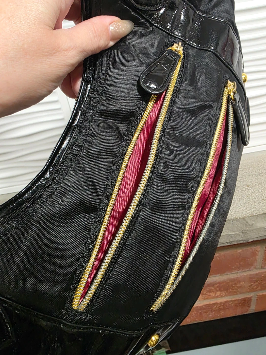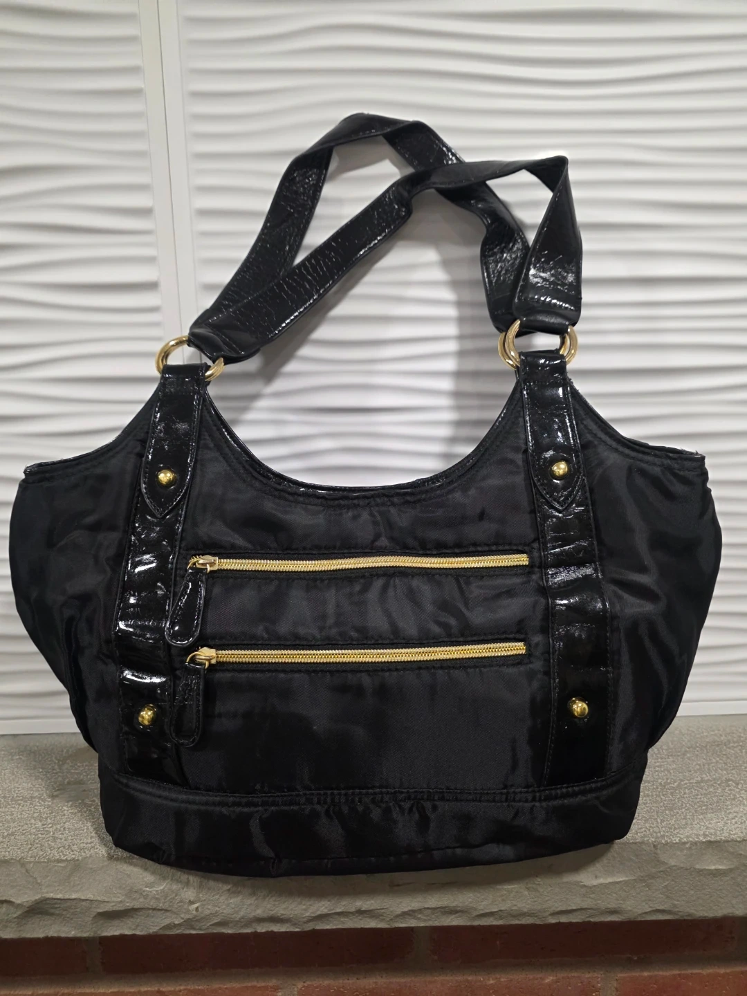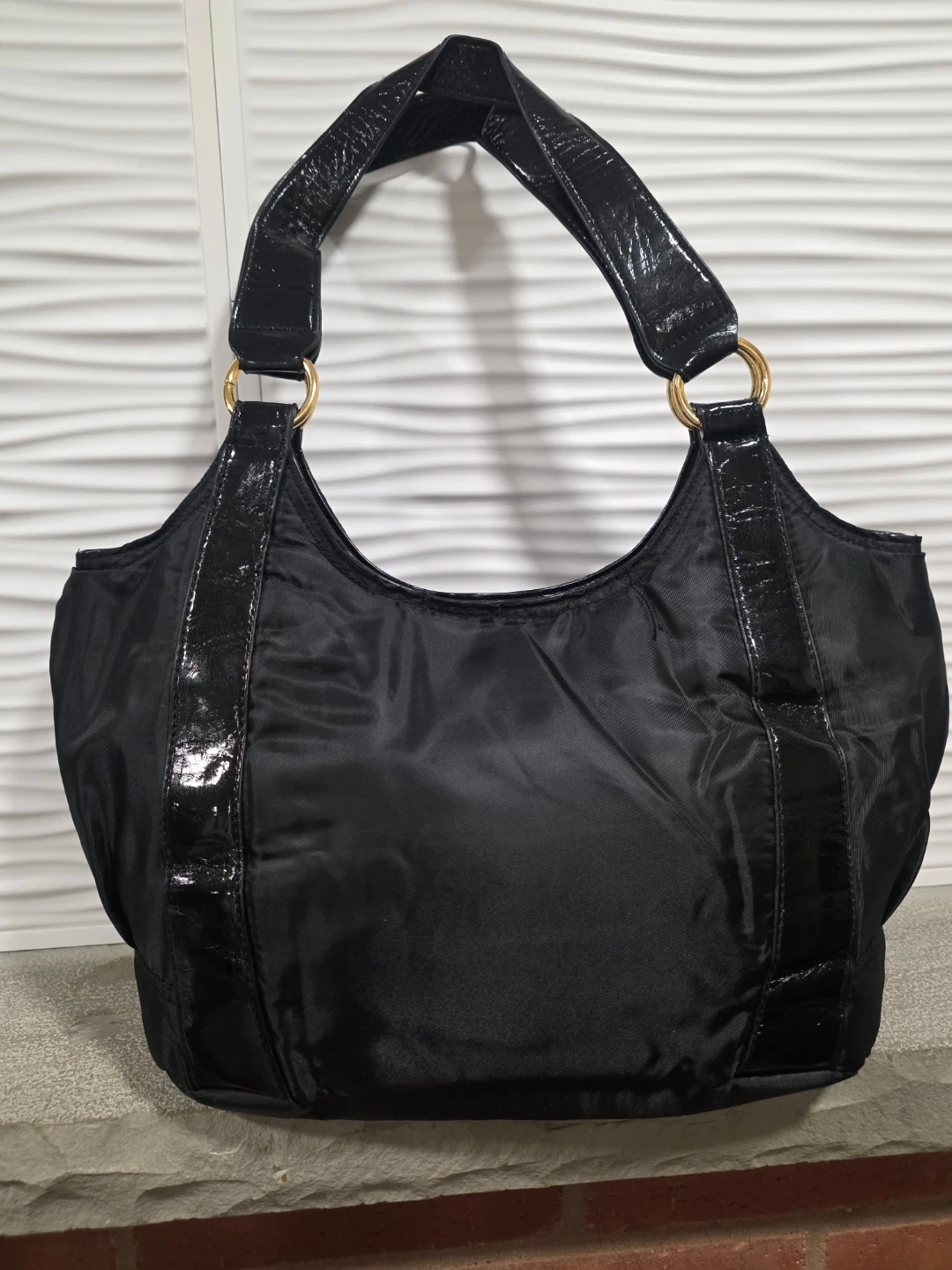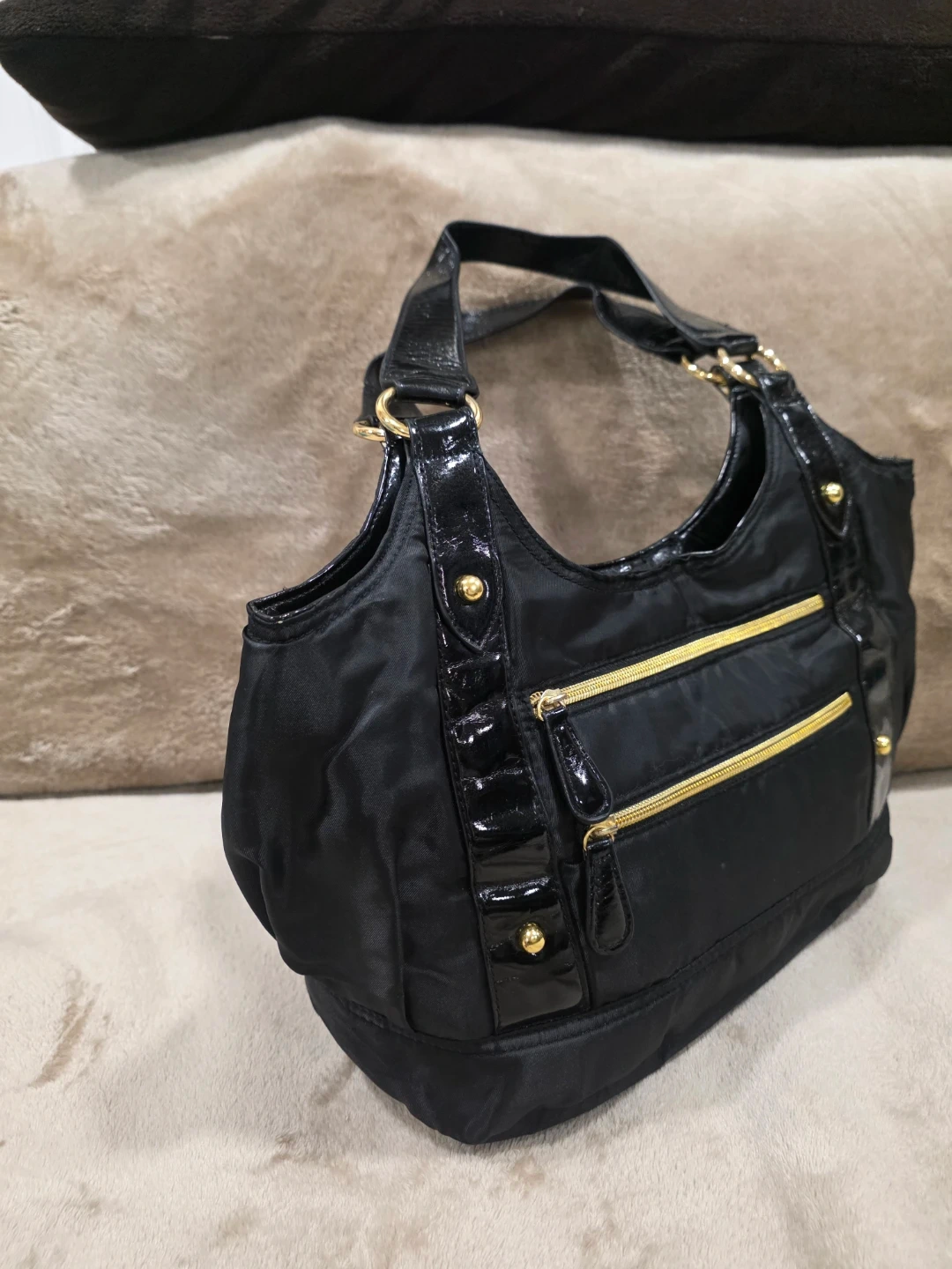 Here's a stylish black nylon tote bag! It features gold-tone hardware and patent leather accents. The interior is lined with a burgundy red fabric and is very specious with few ins& outside compartments to keep you organized, bag is in brand new condition and ready for a new owner .