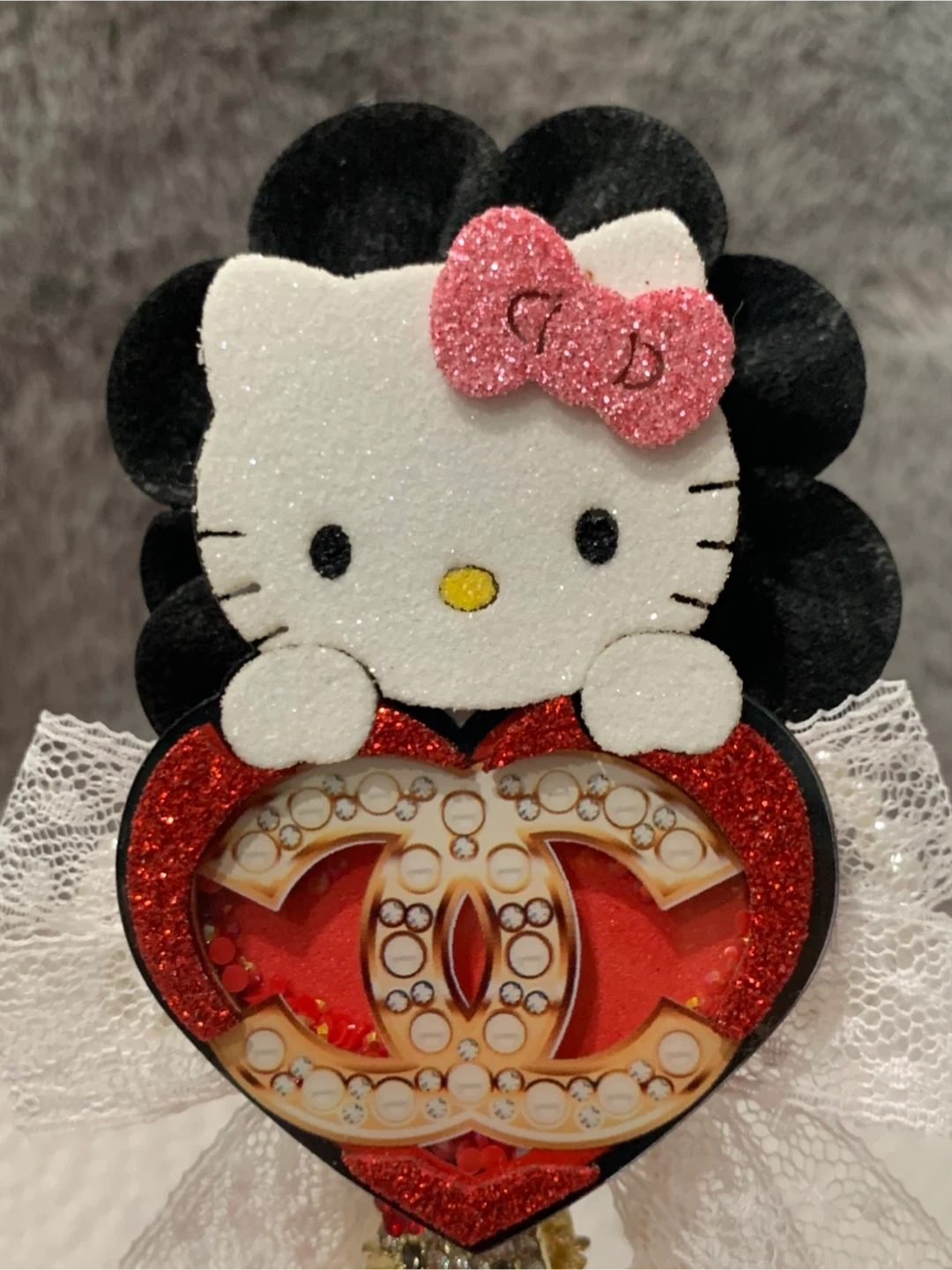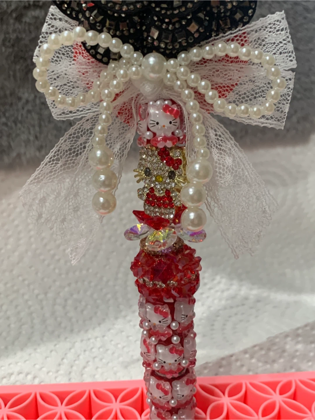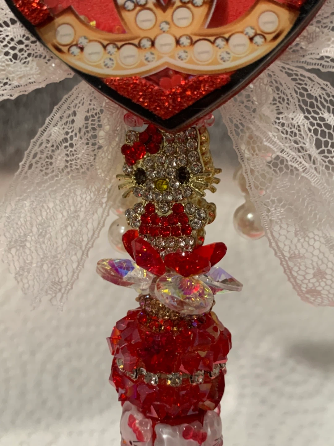 This sparkly fancy pen wand features a Hello Kitty head with a pink bow, holding a red heart charm adorned with rhinestones. The pen is decorated with multiple Hello Kitty faces and pearls. It's covered in red and clear rhinestones and has delicate white lace accents. It's a fancy pen for school or work !!