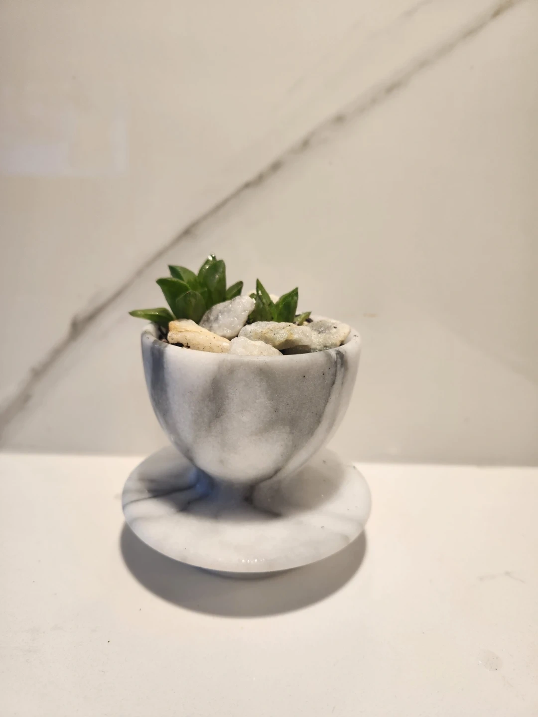 Tiny but mighty cute! This marble cup has been upcycled into a sweet little planter and comes with a low-maintenance succulent. Perfect for desks, shelves, or a small sunny windowsill.
