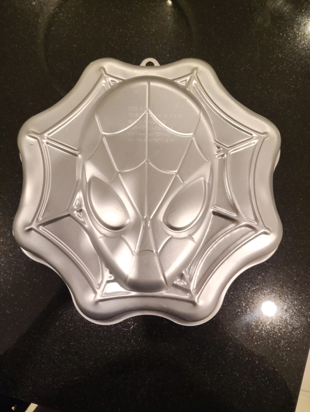 This is a Spiderman face-shaped cake pan. It's made of metal and perfect for baking birthday treats for any superhero fan! Makes a fun cake that kids will love.