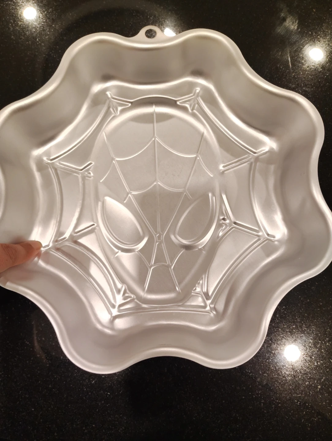This is a Spiderman face-shaped cake pan. It's made of metal and perfect for baking birthday treats for any superhero fan! Makes a fun cake that kids will love.