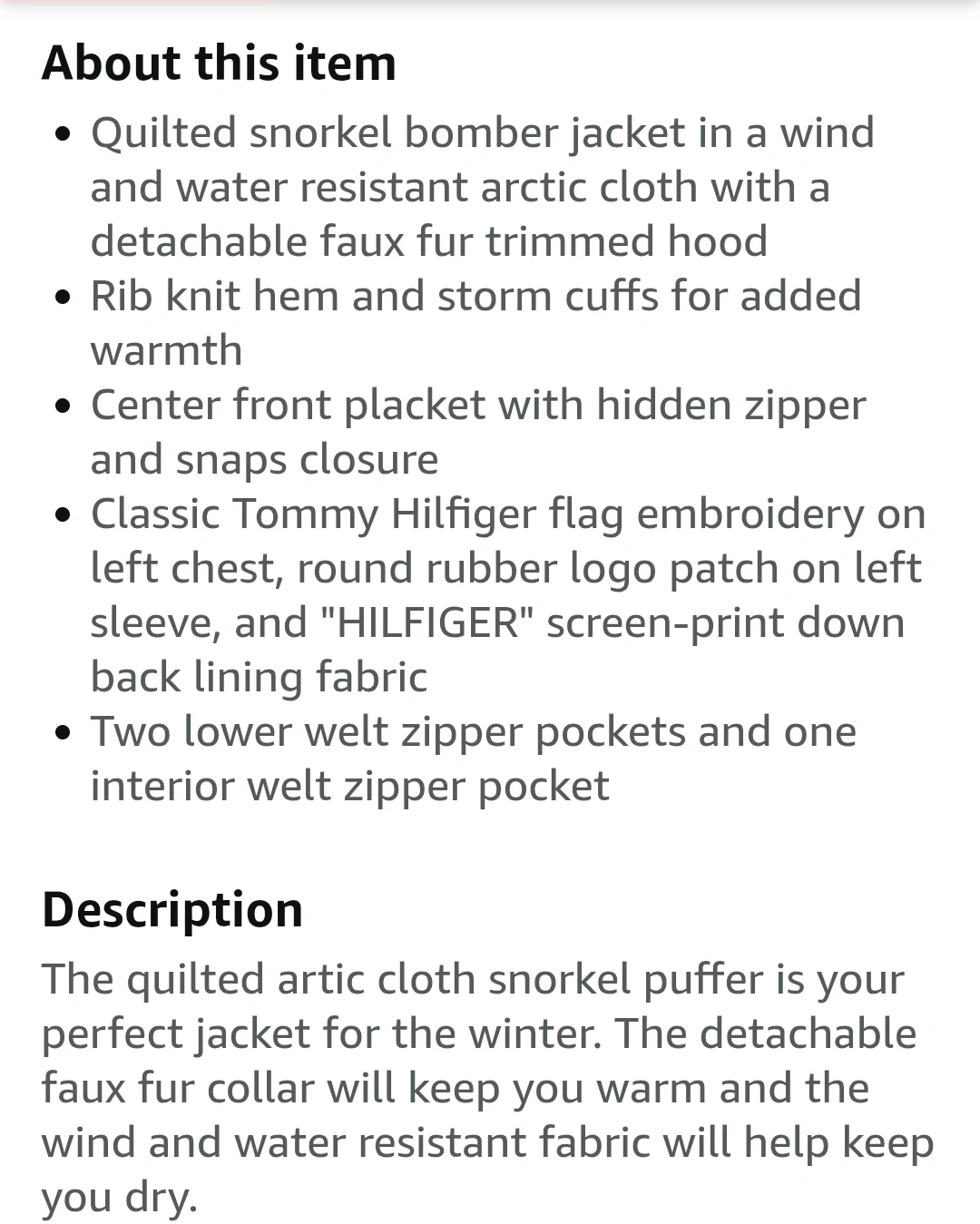 * Quilted snorkel bomber jacket in wind and water resistant arctic cloth with a detachable faux fur trimmed hood