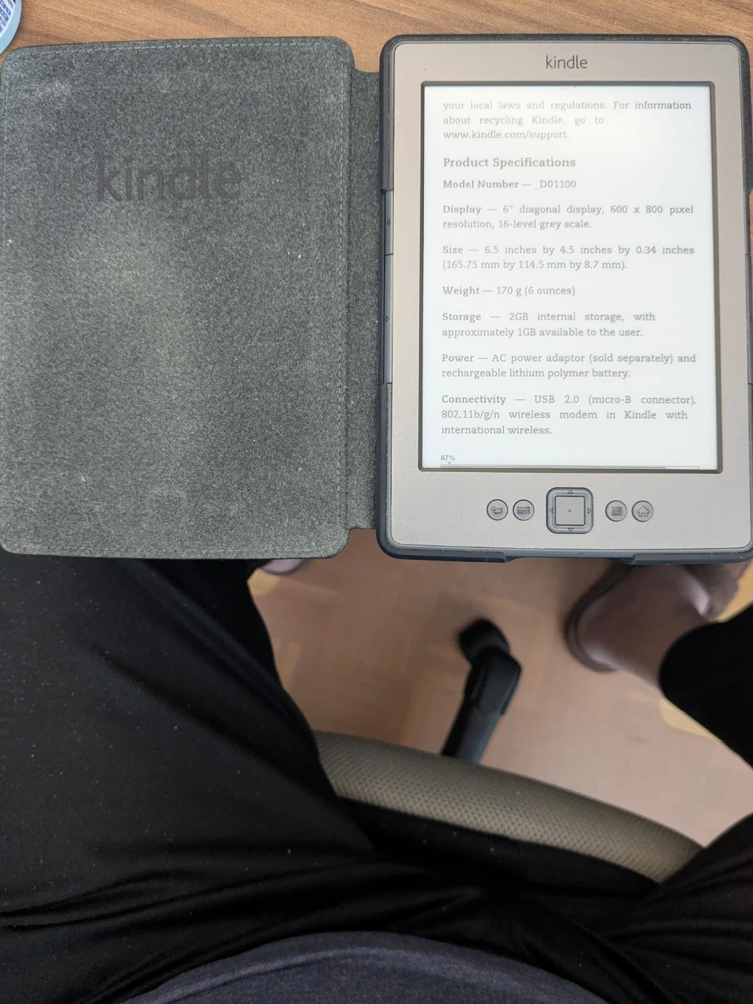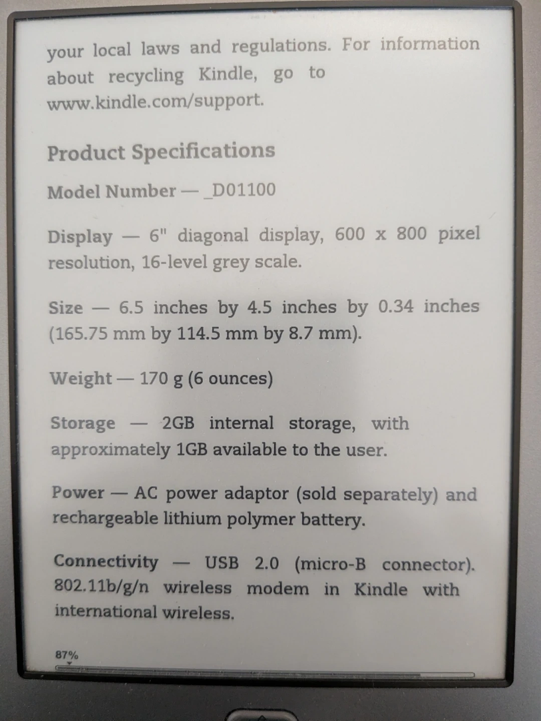 Amazon Kindle e-reader with a 6" diagonal display. It's 6.5" x 4.5" x 0.34" and weighs 170g. It has 2GB internal storage and USB 2.0 connectivity. Great for reading books on the go!