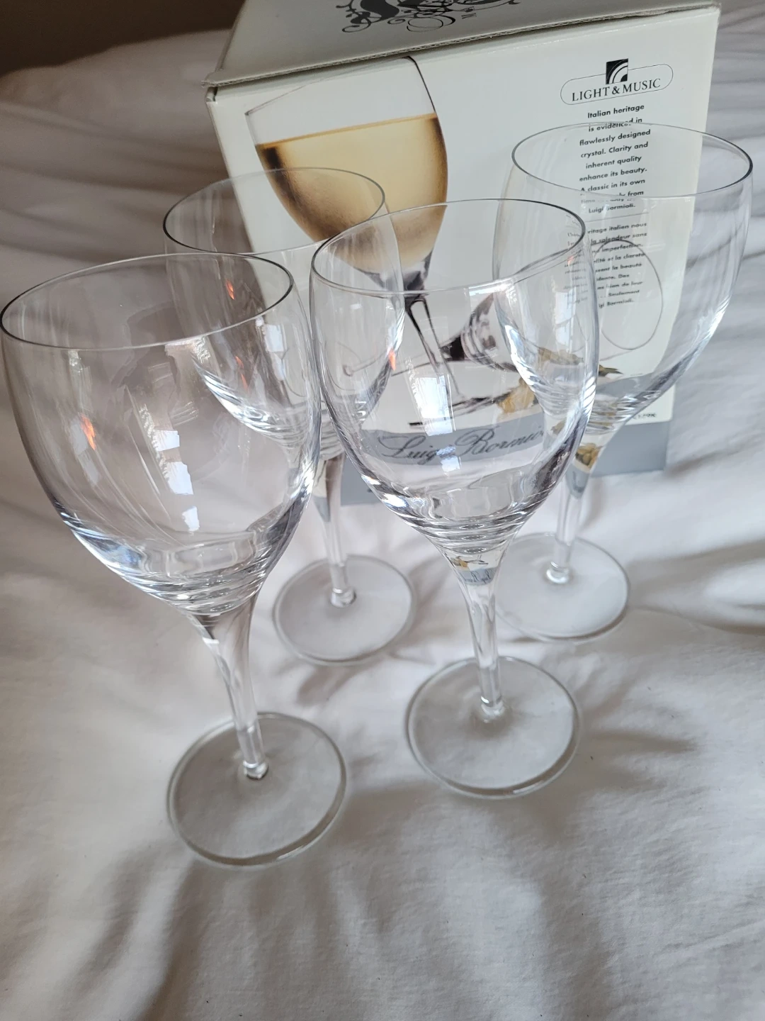 Perfect condition- like new! Four Luigi Bormioli Michelangelo wine glasses. These are 11-ounce capacity, made from crystal and designed for all-purpose use. They offer clarity and inherent quality. Great for serving any beverage!