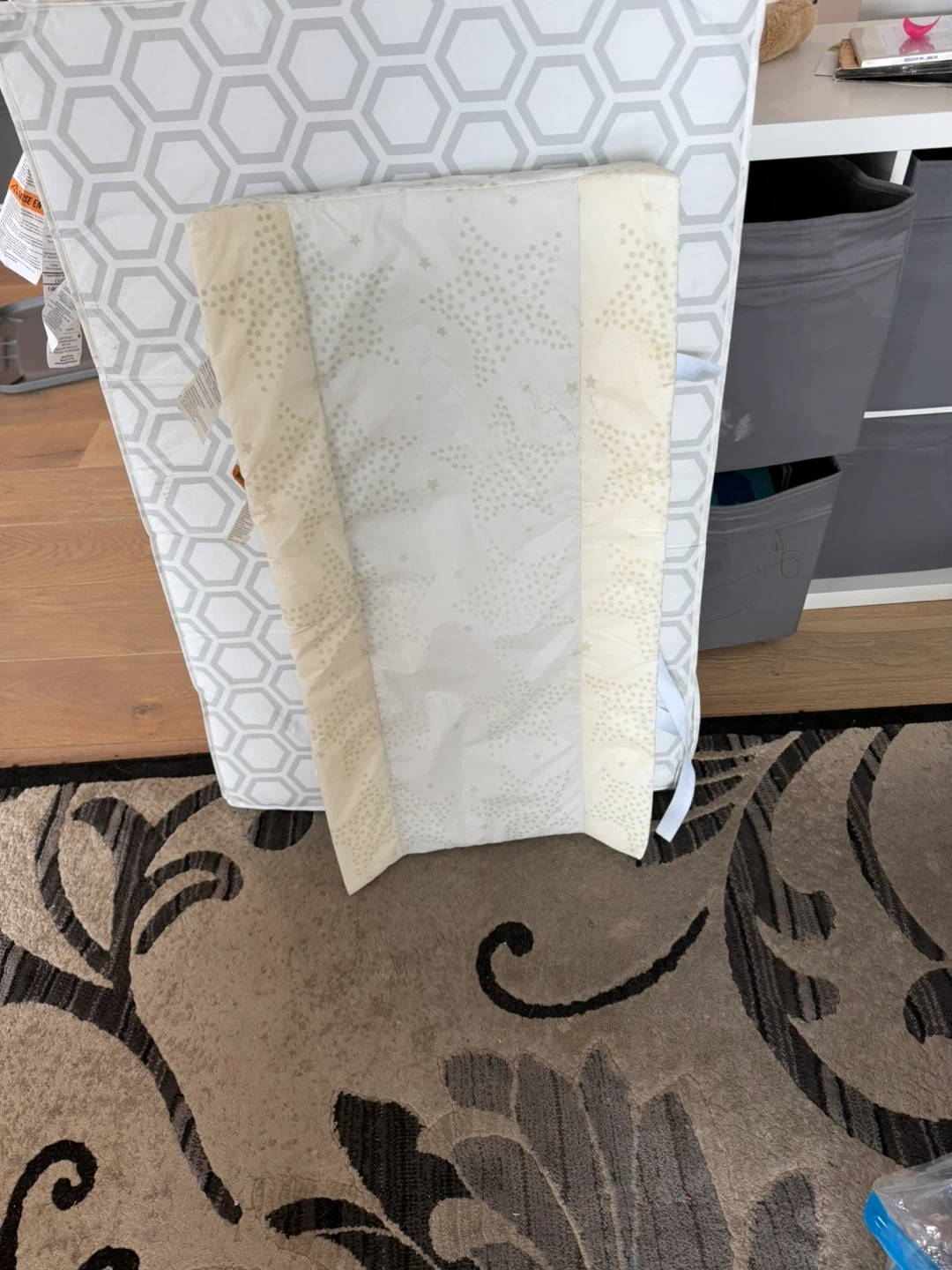 This is a padded changing mat designed for babies. The main changing pad has a grey hexagonal print.