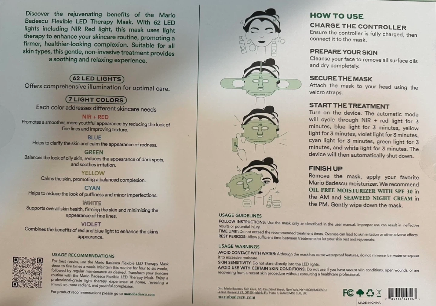 I'm selling a Mario Badescu Flexible LED Therapy Mask. This mask uses 62 LED lights to enhance your skincare routine, promoting a firmer, healthier-looking complexion. It includes 7 light colors to address different skincare needs: NIR + Red, Blue, Green, Yellow, Cyan, White, and Violet. The mask encourages a firmer, more youthful-looking complexion and refines skin texture and tone for a radiant glow