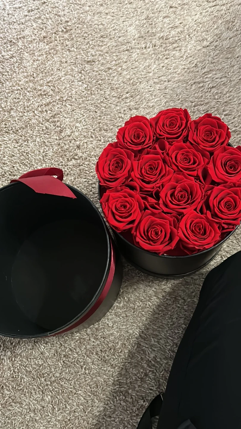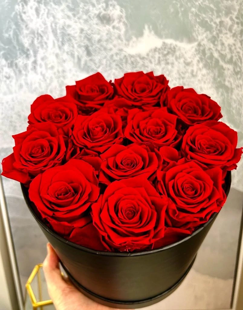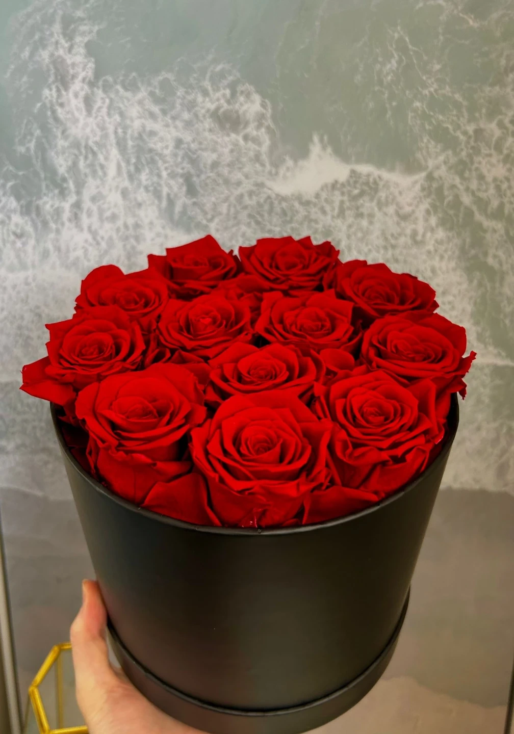 This arrangement features 12 vibrant red preserved roses presented in a sleek black round box. These real red roses are preserved in water and a non toxic silica- based solution. They last between 1-3 years.