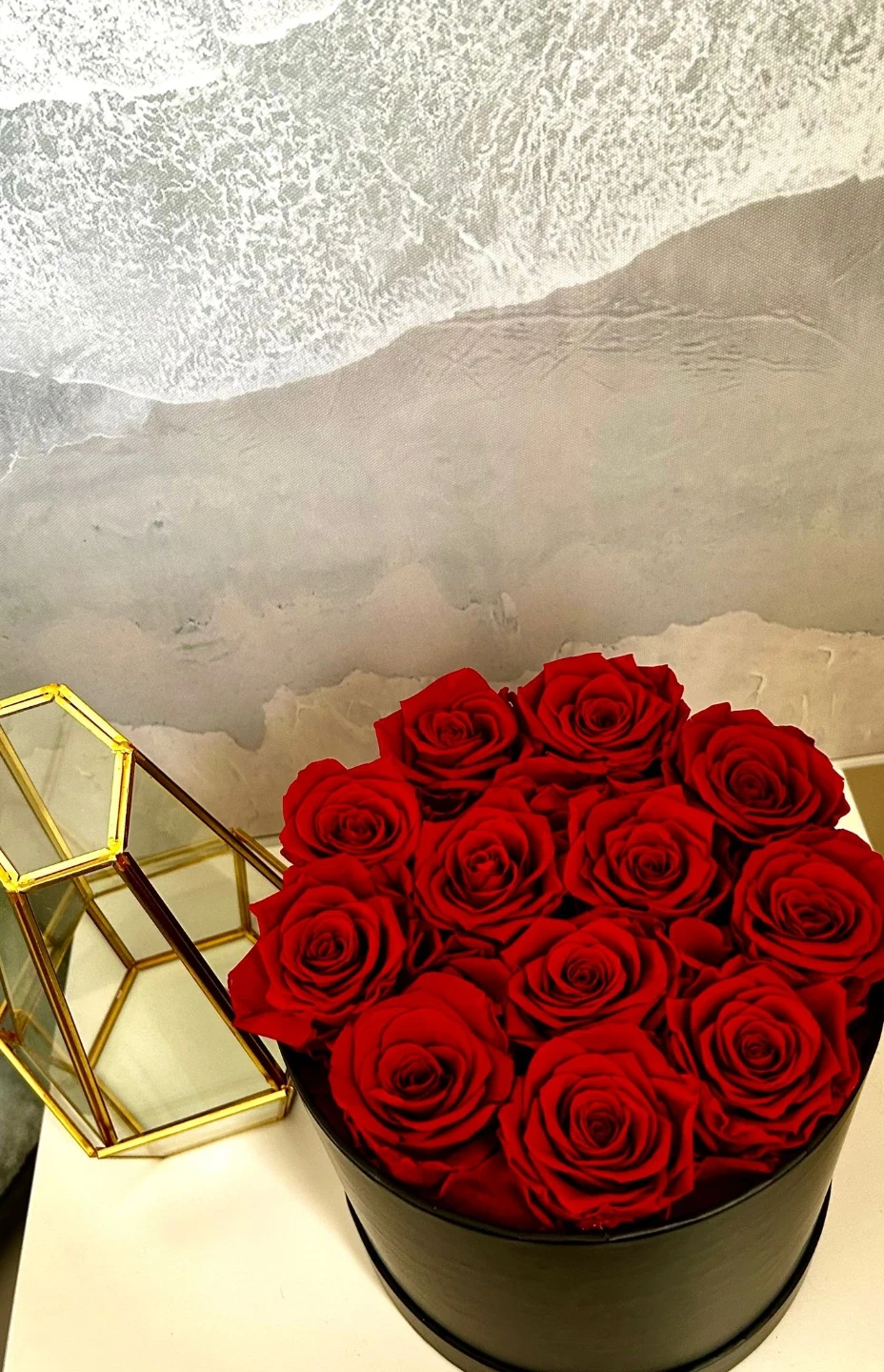 This arrangement features 12 vibrant red preserved roses presented in a sleek black round box. These real red roses are preserved in water and a non toxic silica- based solution. They last between 1-3 years.