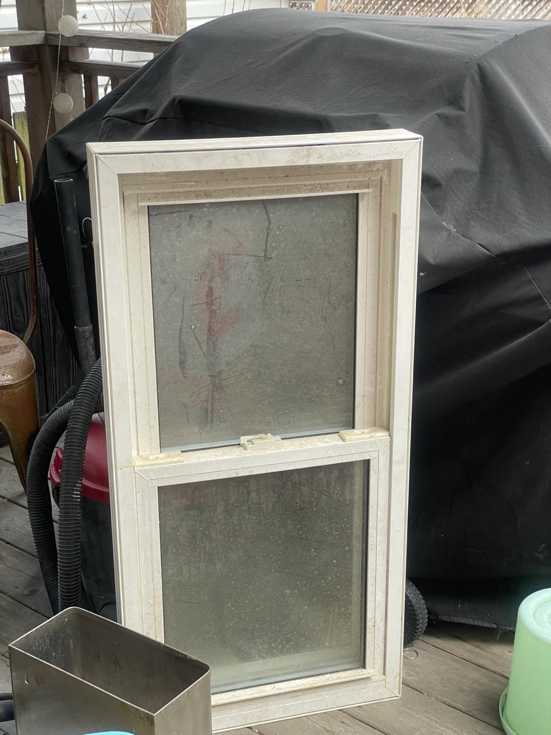 White window frame with double pane glass. Measures approximately 36" H x 24" W. It's a standard double-hung style. Great for a shed or small project!