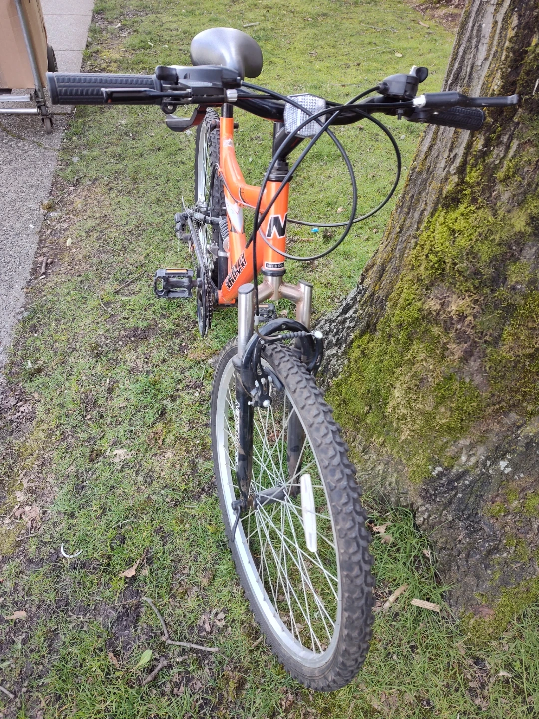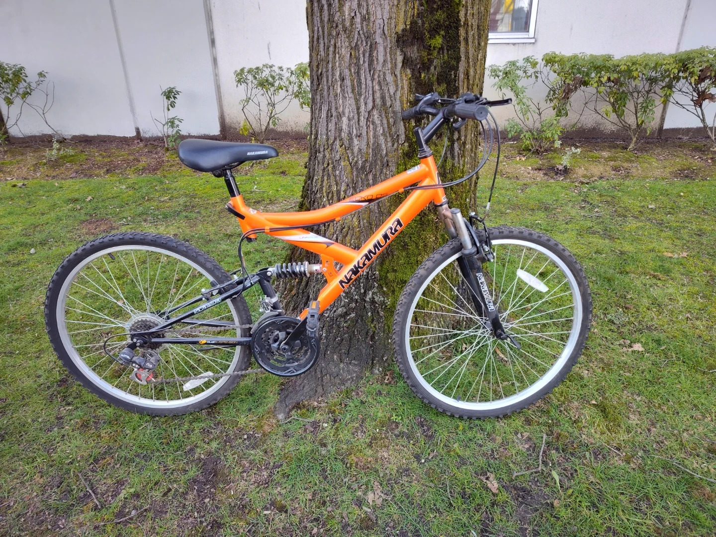 Buy & SellNakamura Mountain BikeNakamura Mountain Bike$73This is an orange Nakamura mountain bike. It has Shimano V-Brake components. Features front suspension and a rear shock absorber.ConditionLike newWHERE TO MEETCheck LocationView MapSELLERverifiedDianeEast Vancouver1366 reviews2 chats·1 favorites·16 viewsSEND CHAT TO SELLERHi Diane! I’m interested in your listing.Hi Diane! I’m interested in your listing.Get the Karrot app to chatSign In to chat