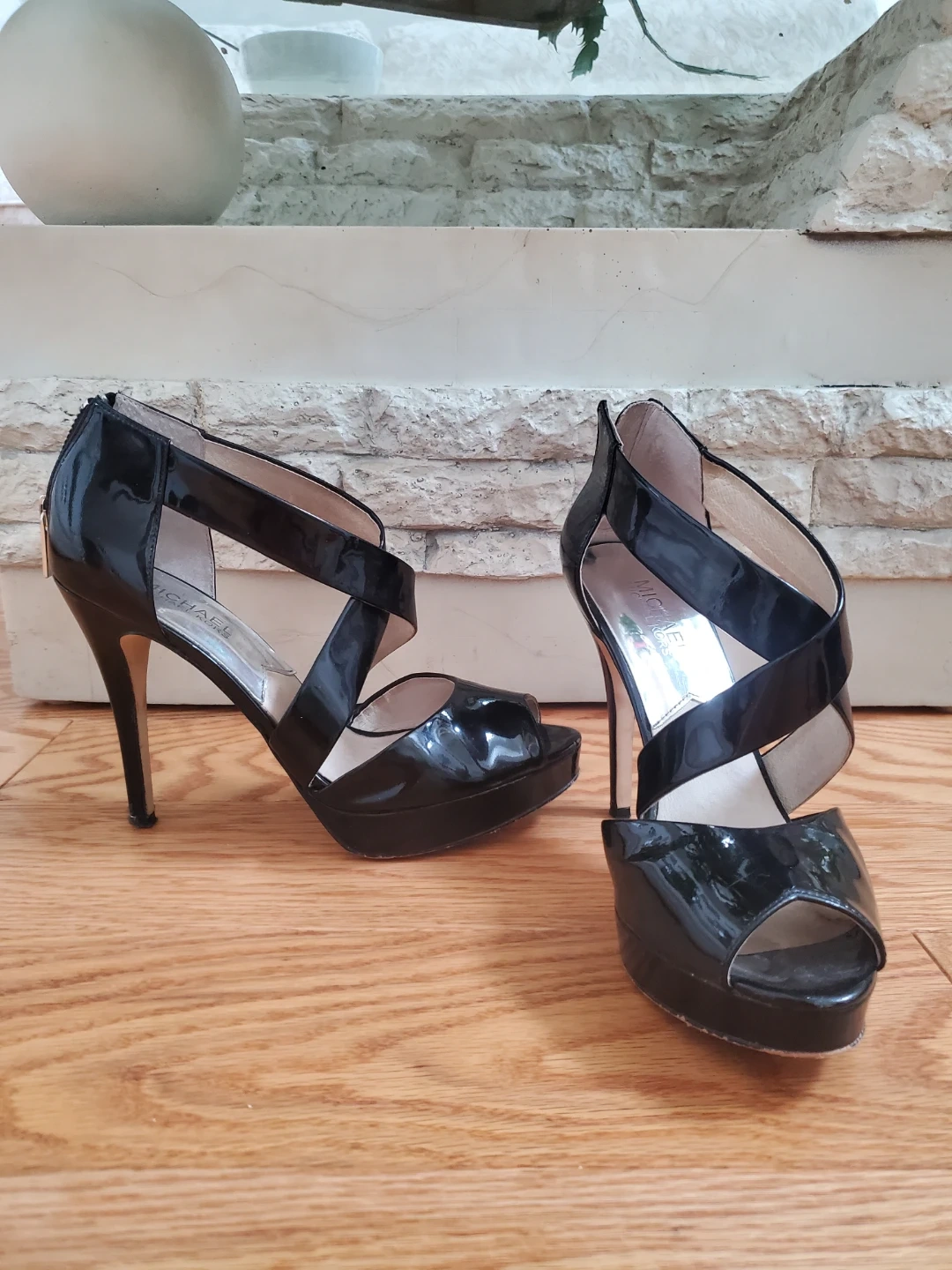 Size 7.5 Black patent leather heels from Michael Kors. Peep-toe style with criss-cross straps and a stiletto heel height of 4". Includes a platform for added comfort.