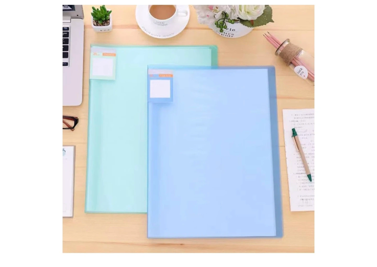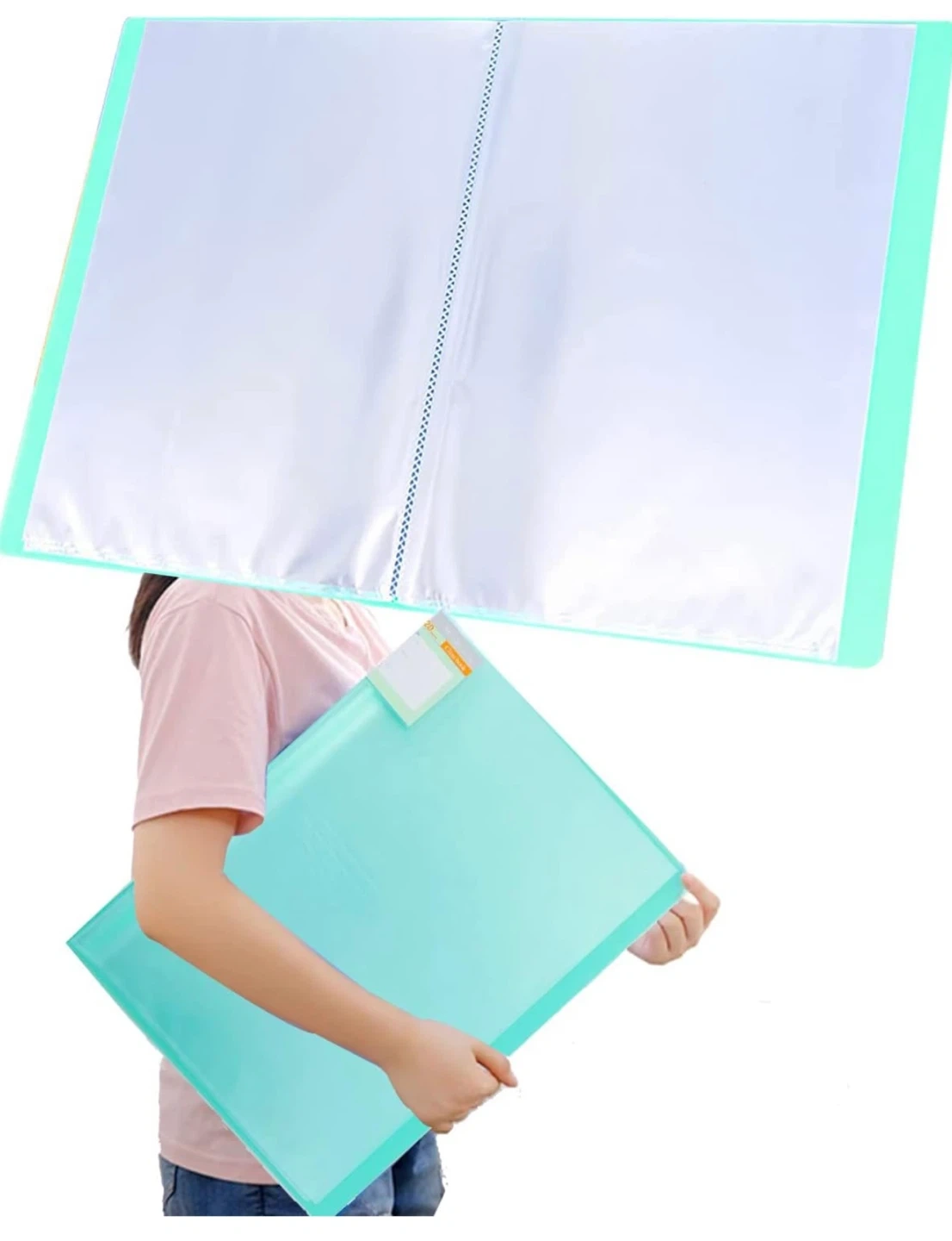 This portfolio binder comes in an aqua blue colour and measures 32cm by 43cm. It's made with a fold-resistant and waterproof material, featuring clear, non-glare, archival-safe pockets for your documents. The binding is firm, ensuring pages don't fall out easily.