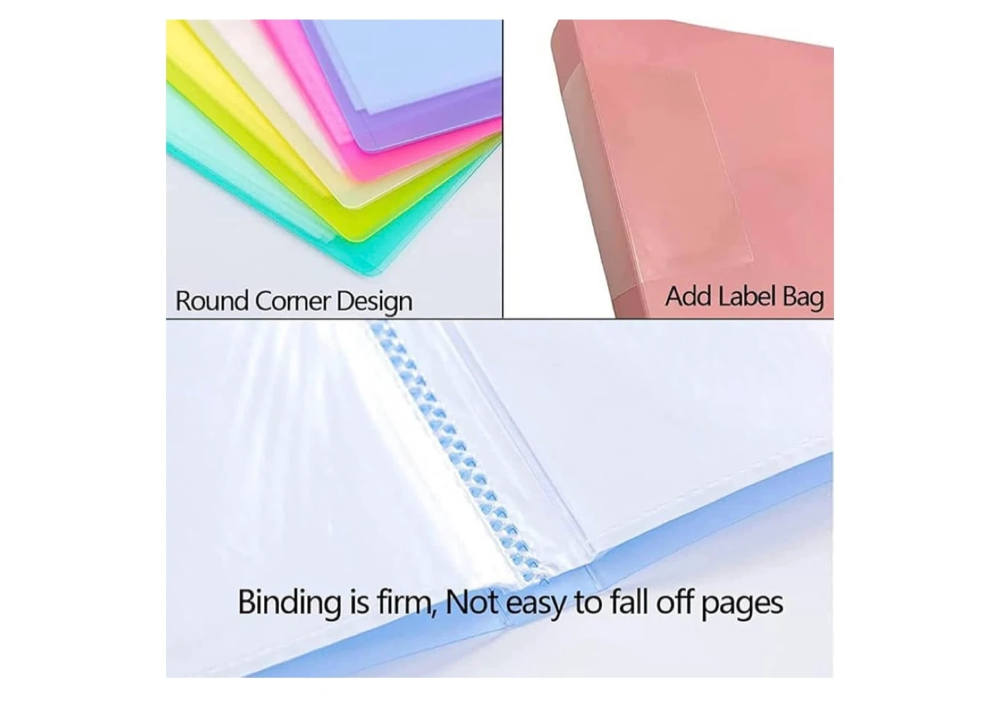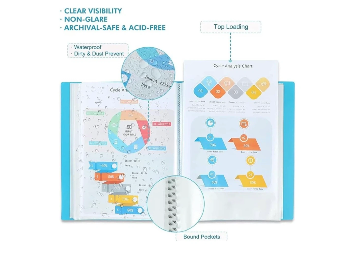 This portfolio binder comes in an aqua blue colour and measures 32cm by 43cm. It's made with a fold-resistant and waterproof material, featuring clear, non-glare, archival-safe pockets for your documents. The binding is firm, ensuring pages don't fall out easily.
