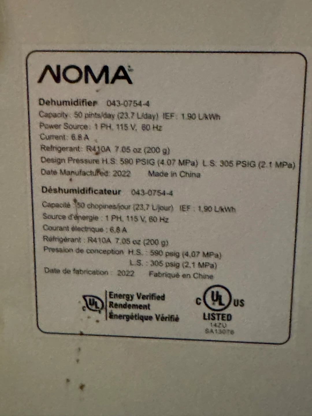 This NOMA 50 pint dehumidifier effectively removes moisture from the air. It's white and has a capacity of 50 pints per day. Manufactured in 2022, it's a reliable unit for your home. The dehumidifier comes with a continuous drain hose option.