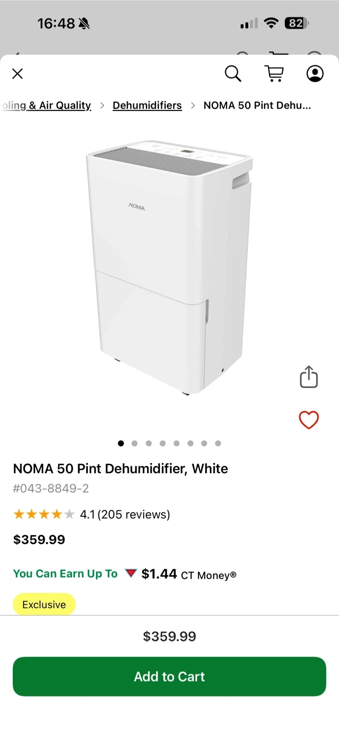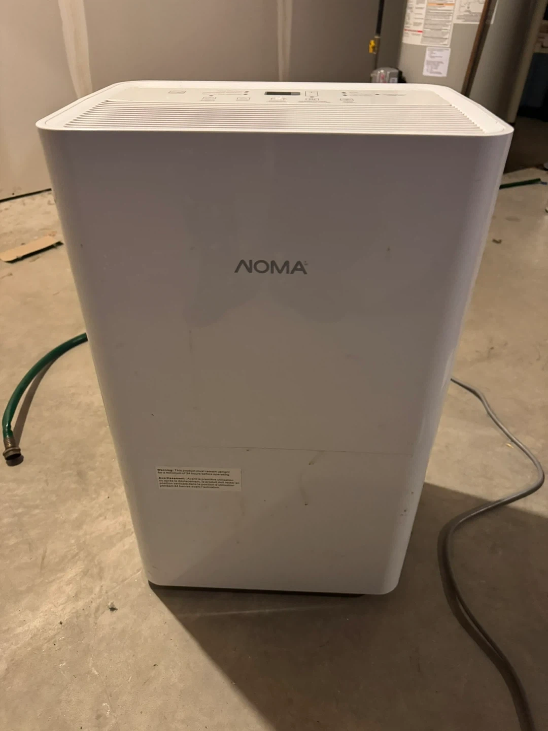 This NOMA 50 pint dehumidifier effectively removes moisture from the air. It's white and has a capacity of 50 pints per day. Manufactured in 2022, it's a reliable unit for your home. The dehumidifier comes with a continuous drain hose option.
