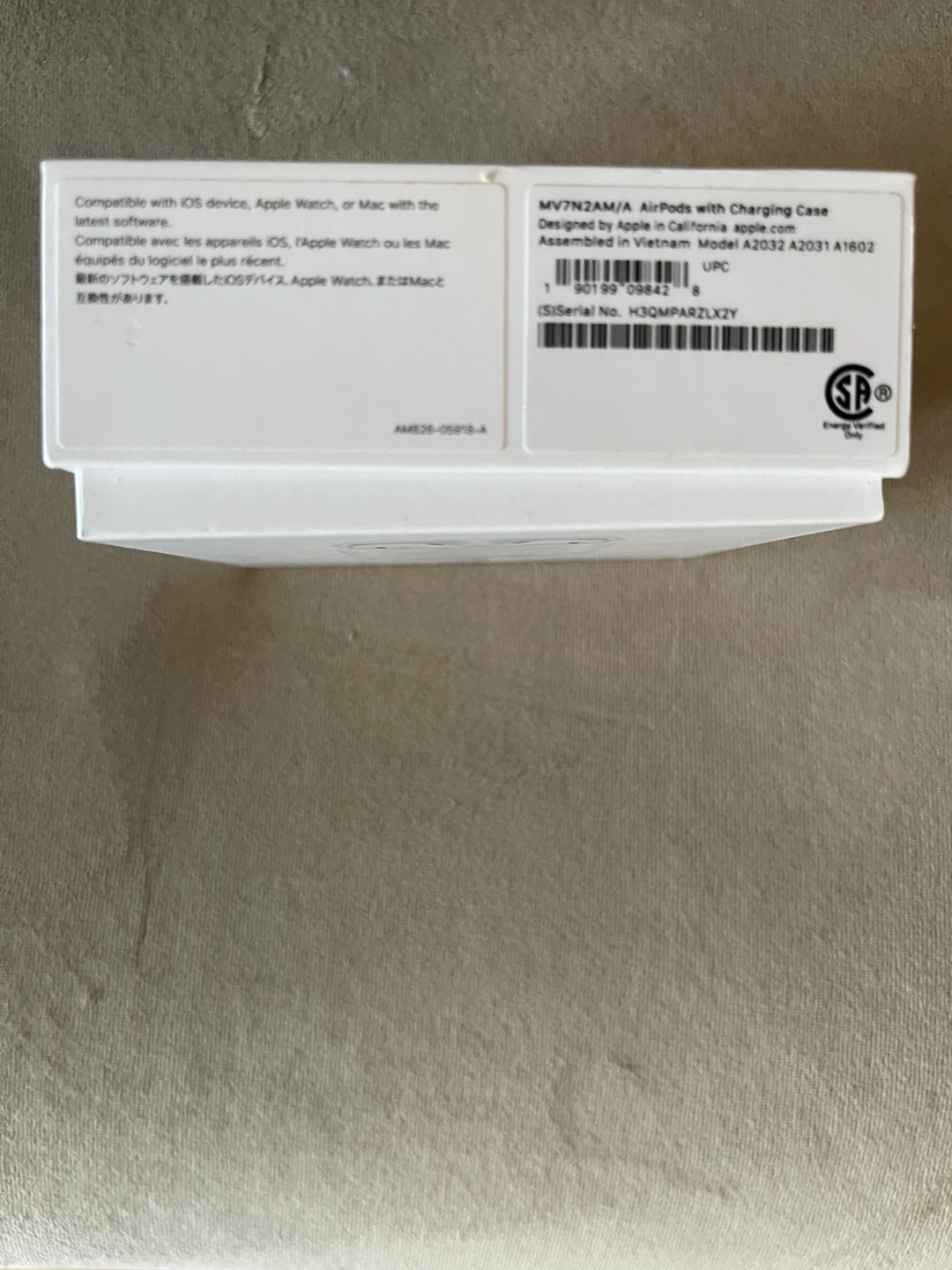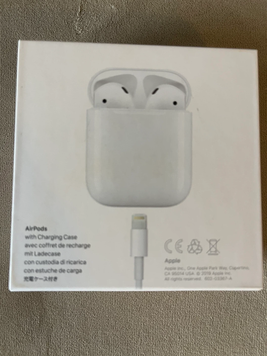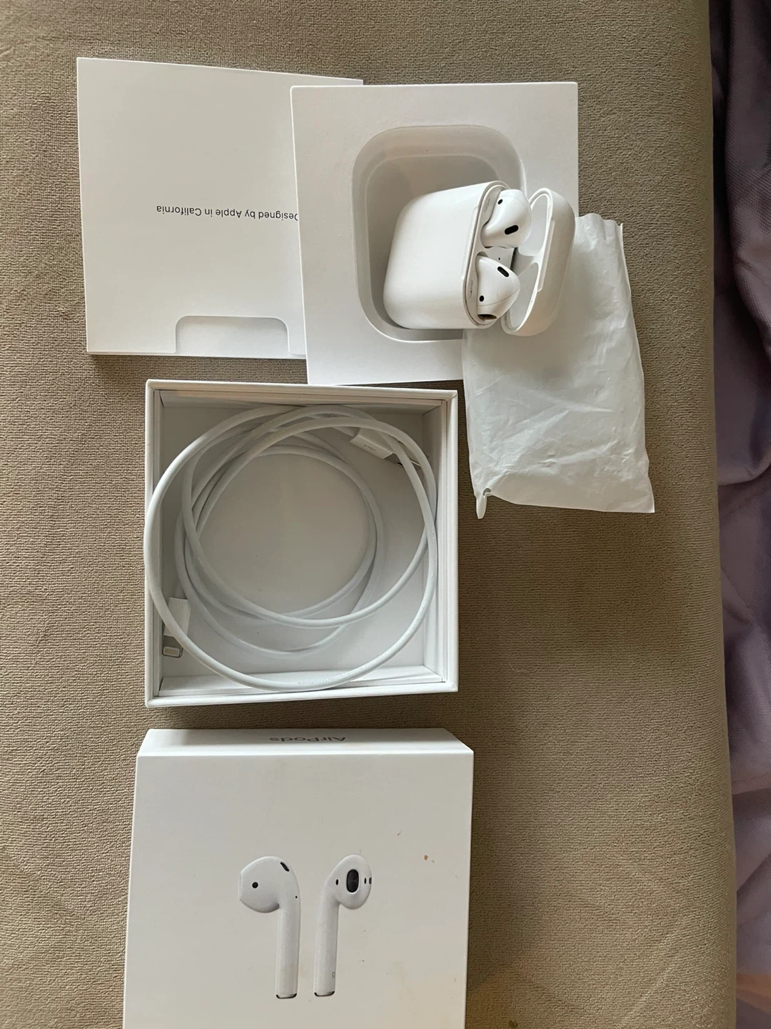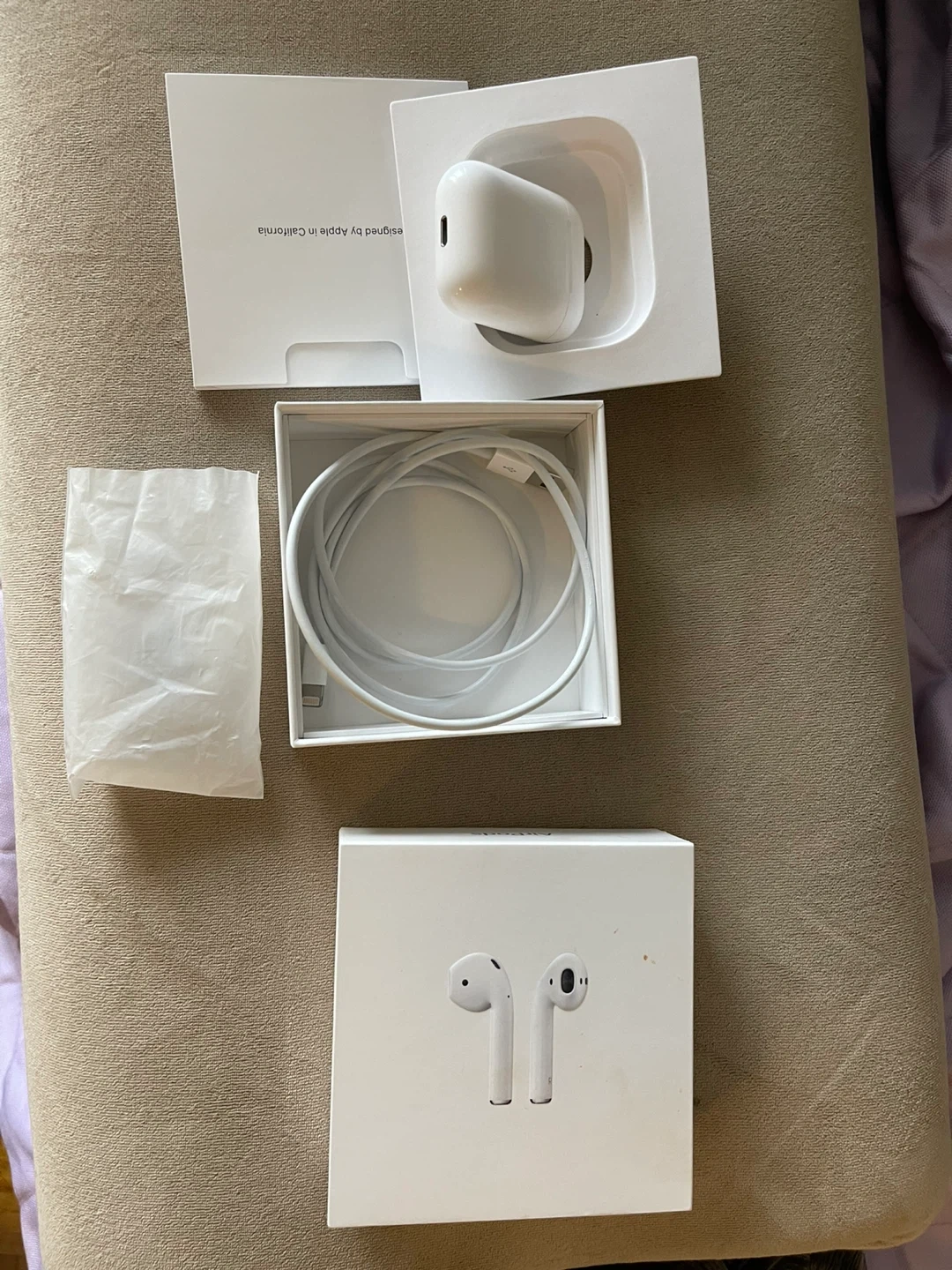 Apple AirPods with a charging case. Comes with original box, charging cable, and documentation. These are in-ear wireless earbuds.