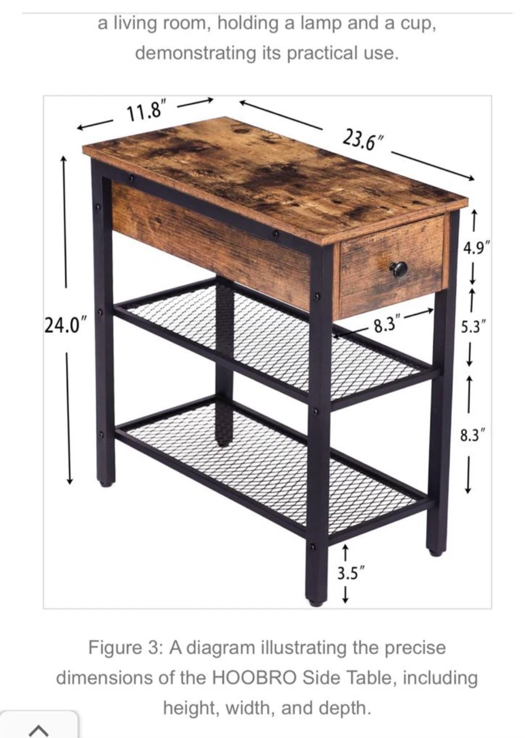 This HOOBRO side table offers a rustic brown finish. Its dimensions are 23.6" W x 11.8" D x 24.0" H. It features a drawer and two wire mesh shelves for storage. This table is great for holding lamps, books, or decorative items in your living room. CASH ONLY!!