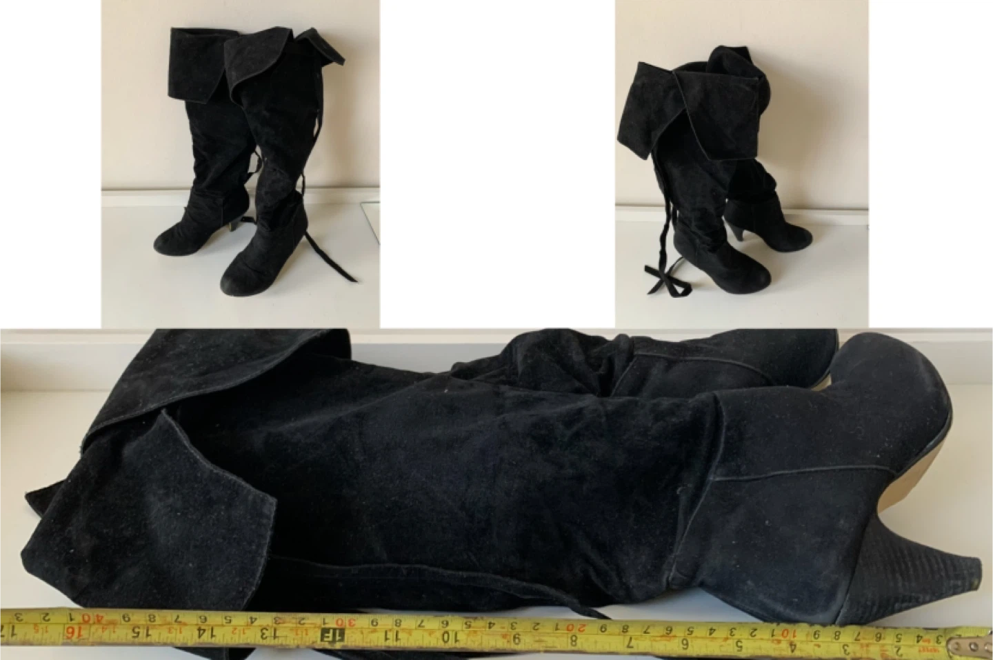 Selling a pair of black suede over-the-knee boots. They have a stylish design and are in good condition. The ruler in the photo can help you estimate the length.